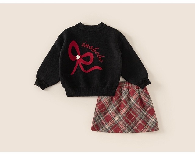 冬用 子供用 ブラック レッド リボンデザイン ニットトップス チェック柄 女の子 防透け 裏地付き スカート セット 暖かく柔らかな肌触り 冬 カジュアル おしゃれ スタイル サイズ120-160cm キッズ