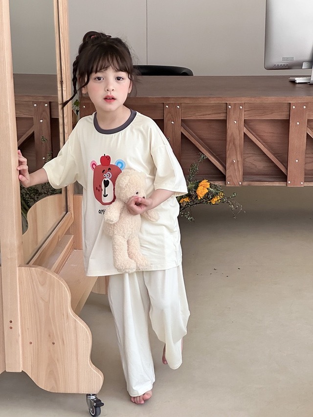 子供用ルームウェア上下セット ベアプリントTシャツ&ゆったりパンツ セットアップ 半袖トップス+ロングパンツ 綿混素材 ナチュラルホワイト系 キッズパジャマ 可愛いクマ柄 男女兼用 90cm~170cm 春夏秋対応
