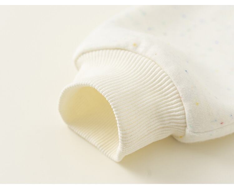 おしゃれで可愛らしいデザインのキッズ用長袖トレーナーです。柔らかくて肌触りの良い**コットン65%・ポリエステル35%**の混紡素材を使用しており、春秋シーズンにぴったりのアイテムです。