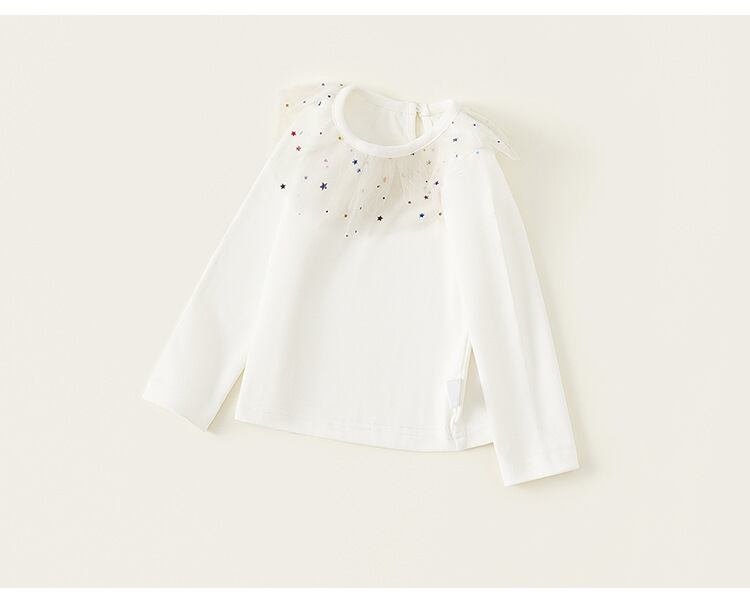 柔らかく肌触りの良いコットン混素材を使用した、可愛らしい星空刺繍チュール付きの長袖カットソーです。通気性と伸縮性に優れ、快適な着心地を提供します。シンプルなラウンドネックデザインと、背面のボタン仕様でお着替えも簡単。星空をイメージした細やかな刺繍が施されたチュール素材が、上品で華やかな印象を与えます。