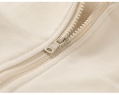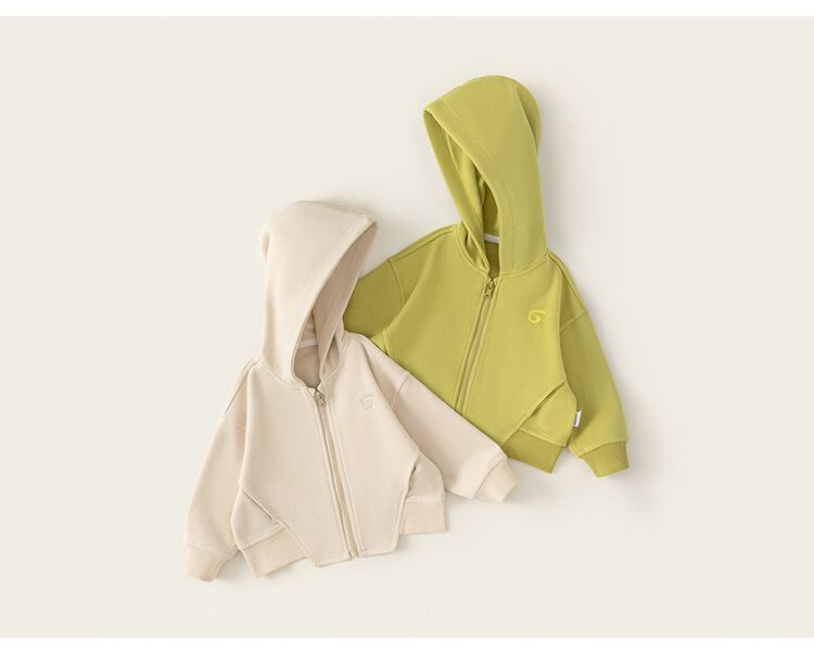 ジップアップデザイン:フルジップ仕様で着脱が簡単。お子様自身でも脱ぎ着しやすい。