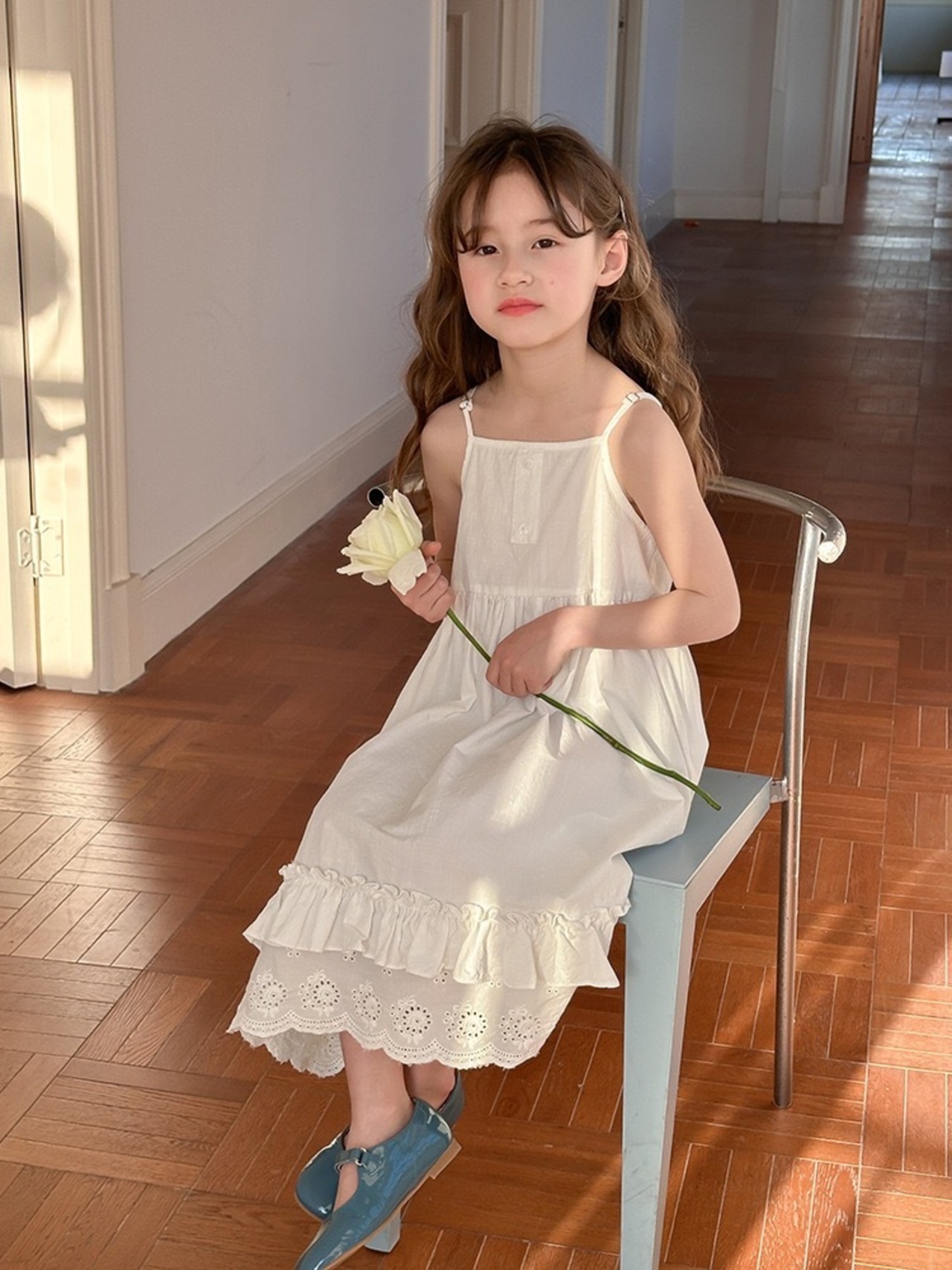 ナチュラルで上品なデザインのキッズサマーワンピース。繊細なレース刺繍と軽やかなフリルが魅力!