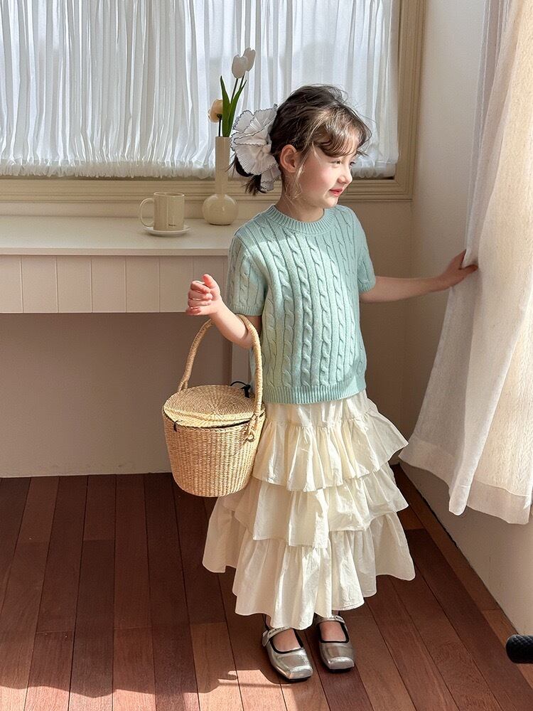 おしゃれで上品な印象を与えるキッズ用ケーブルニット半袖トップス。シンプルながらもトレンド感のあるデザインで、さまざまなコーディネートにマッチします。韓国風のナチュラルな雰囲気が魅力的で、普段着はもちろん、お出かけコーデにも最適です。