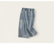 シンプルでおしゃれなキッズ用デニムワイドパンツ。柔らかい綿100%素材を使用し、動きやすく快適な履き心地。春秋シーズンに最適な一本です。