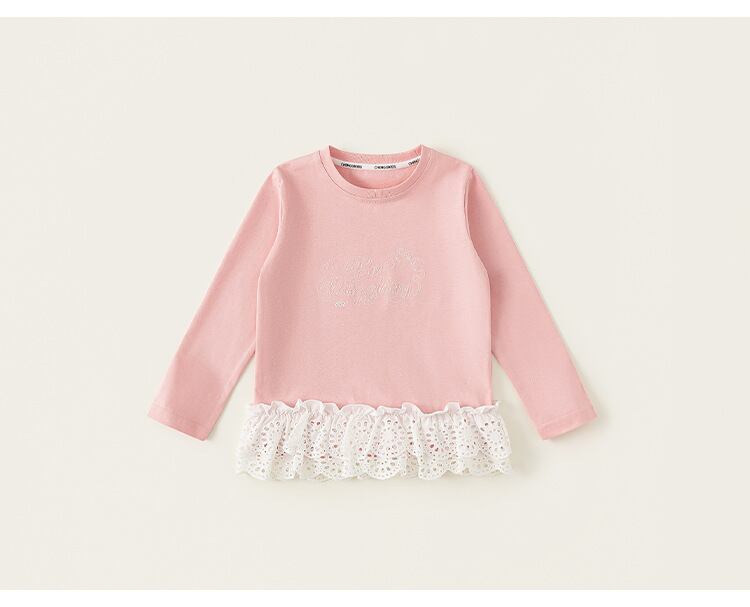 おしゃれで可愛らしい女の子向けの長袖カットソー。個性的な刺繍デザインが施され、柔らかなレースフリルが裾にあしらわれた上品な一着です。綿100%の優しい肌触りで、快適な着心地を実現。春秋シーズンにぴったりのアイテムです。