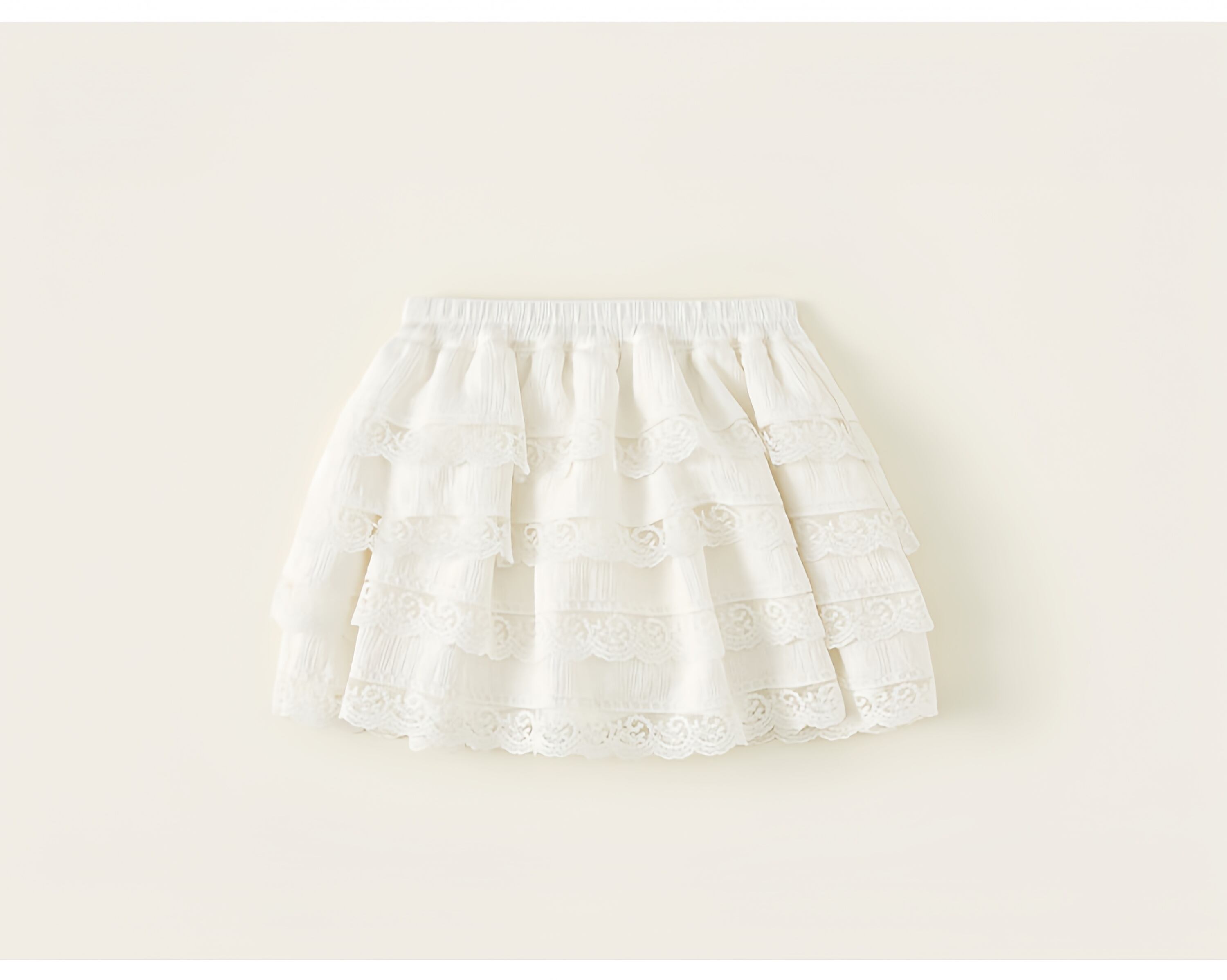 ナチュラルで優雅な雰囲気を演出する、女の子用のフリルスカートです。軽やかな素材と繊細なレース装飾が特徴で、お子様の可愛らしさを引き立てます。裏地付きの設計により、透け感を気にせず安心して着用できます。