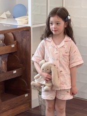 柔らかなコットン素材を使用した、夏にぴったりのキッズ用パジャマセットアップです。半袖シャツとショートパンツの上下セットで、通気性がよく肌触りも優しく、お子様のナイトウェアとして最適です。