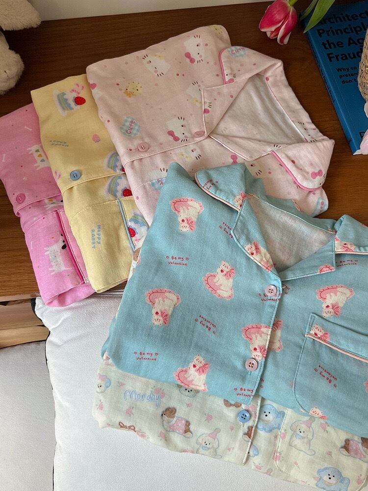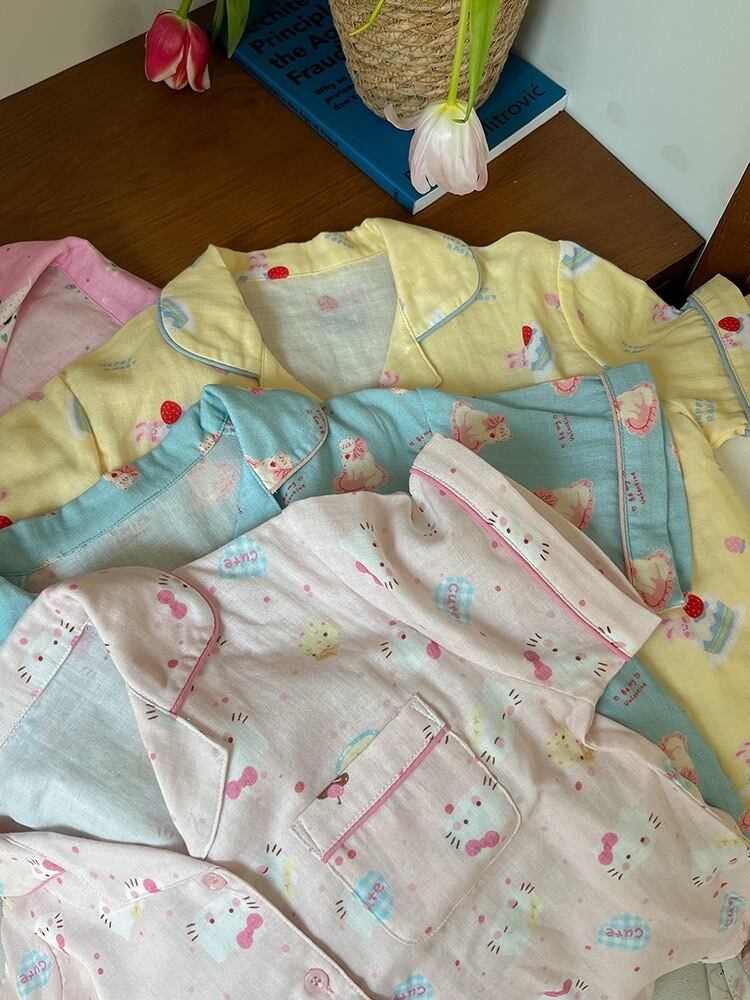パジャマ全体にはネコ・リボン・アイスクリーム・お花・星などの総柄デザインがプリントされており、見ているだけで楽しいデザインです。