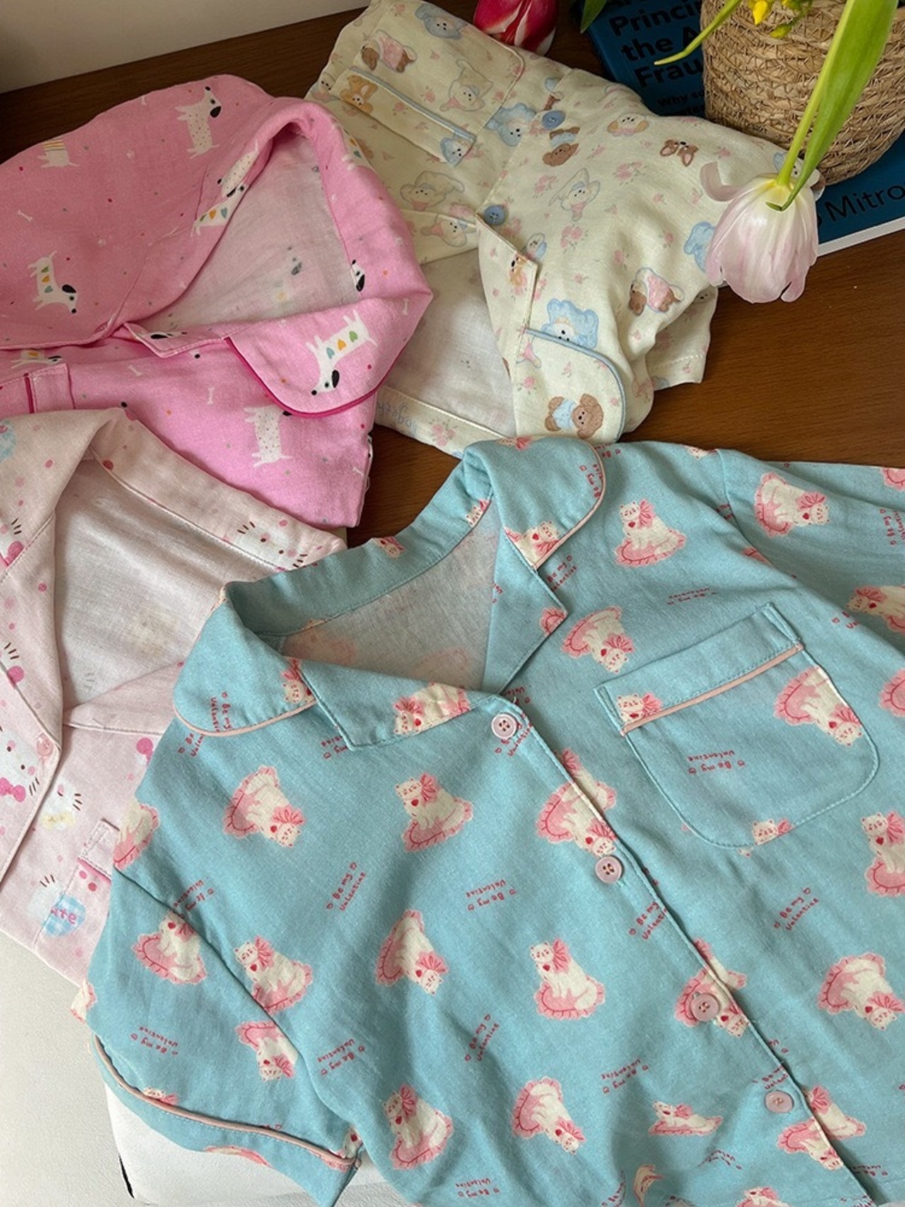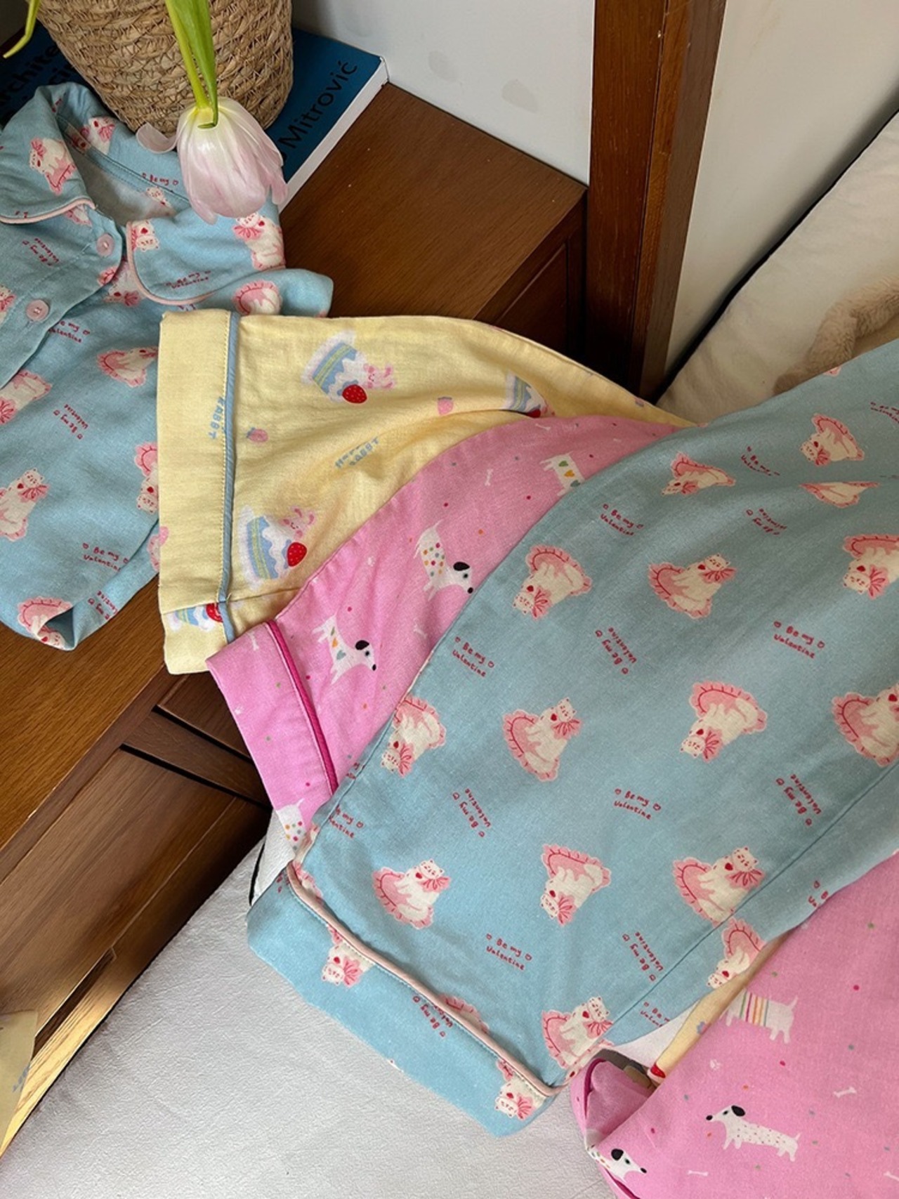 トップスは前開きボタン仕様で、ひとりでの着脱も簡単。襟は丸襟で可愛らしく、袖口やパンツ裾にはパイピングデザインが施されています。