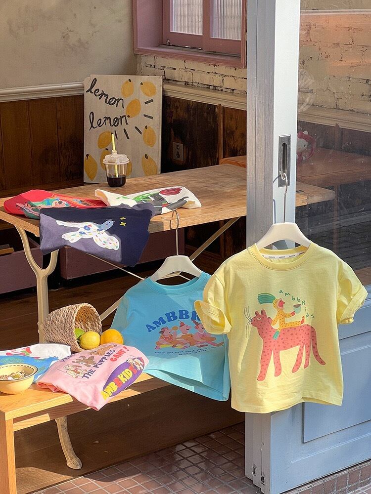 韓国子供服、キッズTシャツ、英字プリントTシャツ、男女兼用、綿100%、カジュアルトップス、春夏半袖Tシャツ、シンプルデザイン、通園通学服、小学生ファッション、ベーシックスタイル、おしゃれTシャツ、サイズ90cm〜170cm対応