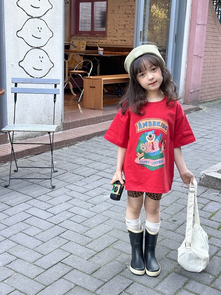 春秋新作 Tシャツ ハッピーサプライズ アニマルプリント半袖Tシャツ レッド ユニセックス キッズ 半袖 カジュアル トップス 春夏 秋 韓国風 ストリート風 子供服 90cm〜170cm | Oct.ベビーショップ