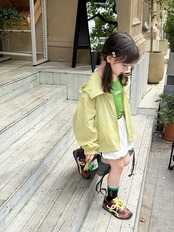 生地は軽量かつ通気性に優れたナイロン素材を使用しており、さらりと羽織るだけで紫外線対策もおしゃれも叶います。袖口には便利な指穴デザインが施され、手の甲までカバーできるため、日焼け対策も万全。フロントはファスナー式で着脱も簡単、小さなお子様でも一人で着られます。