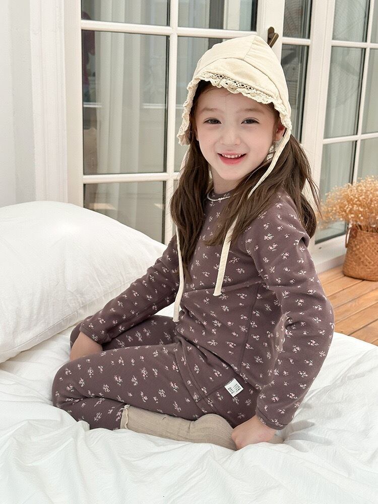 長袖パジャマセット 小花柄 ダークブラウン 綿95% 裏起毛 抗菌加工 キッズ 女の子 上下セット ルームウェア 寝巻き ナチュラルカラー 80〜170cm 秋冬用 保育園 お昼寝肌着 | Oct.ベビーショップ