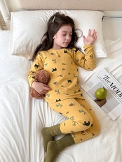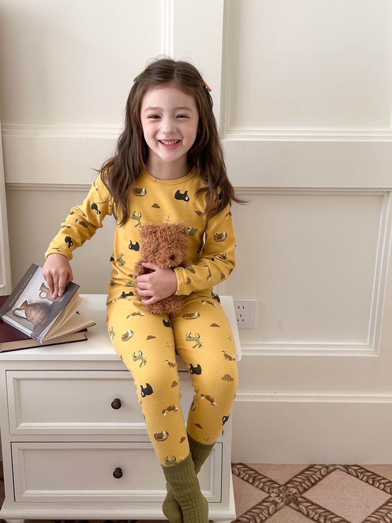 長袖ルームウェアセット 動物柄 マスタードイエロー 裏起毛 抗菌加工 綿95% 子供服 パジャマ 上下セット 女の子 秋冬対応 部屋着 保育園パジャマ対応 80〜170cm展開 | Oct.ベビーショップ