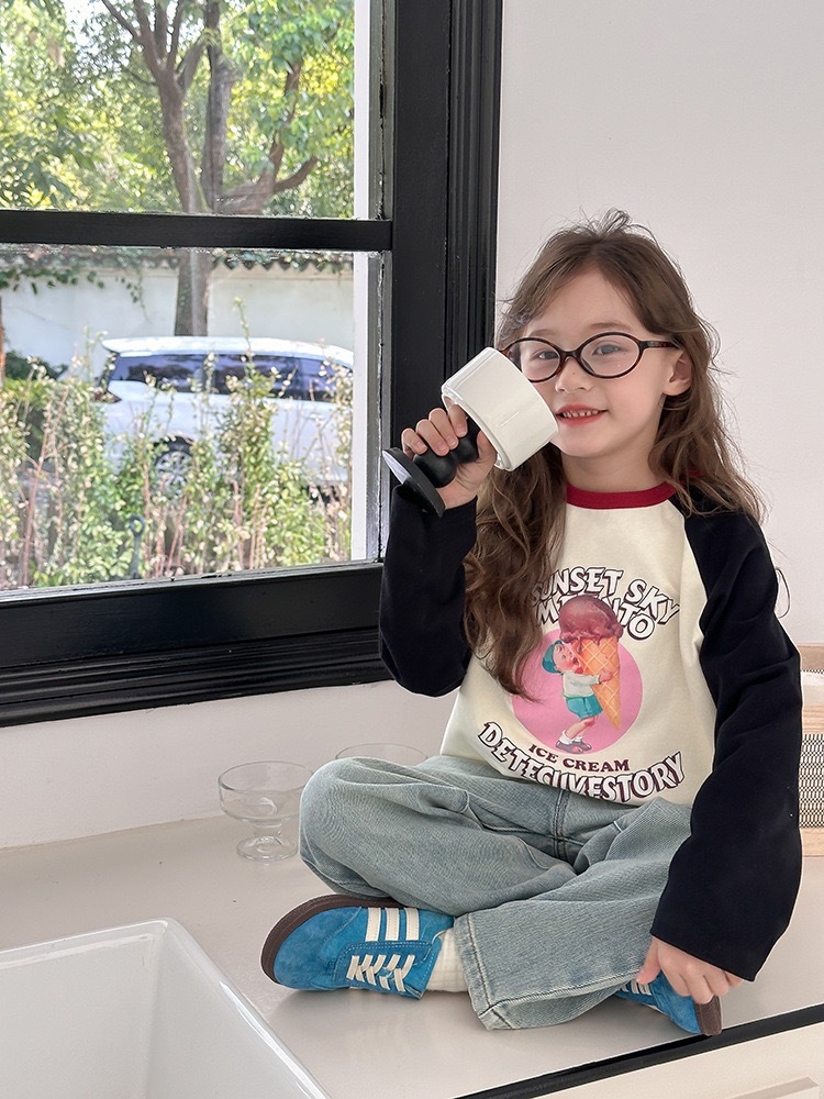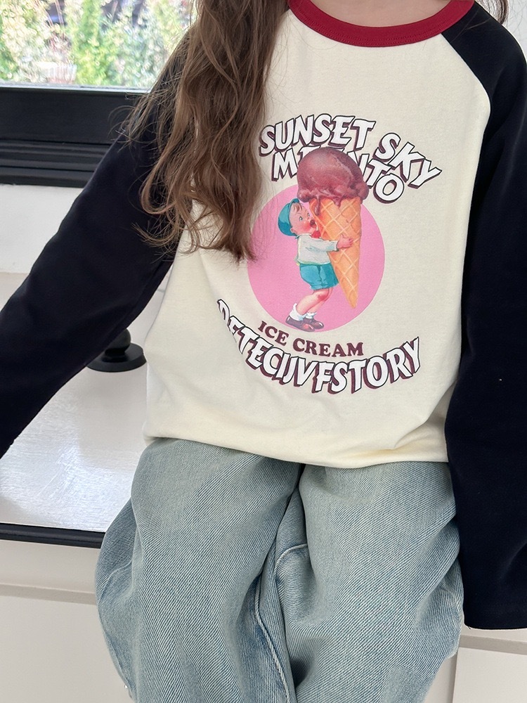オフホワイトの身頃にブラックの袖を合わせた、落ち着きのある配色が魅力のラグラン長袖Tシャツ。フロントには可愛いアイスクリームモチーフのプリントが施され、遊び心とポップさを兼ね備えたデザインです。首元にはアクセントカラーのワインレッドをプラスし、おしゃれ度をぐっと引き上げます。やわらかいコットン素材を使用しており、通気性と肌触りがよく、季節を問わず快適に着用できます。