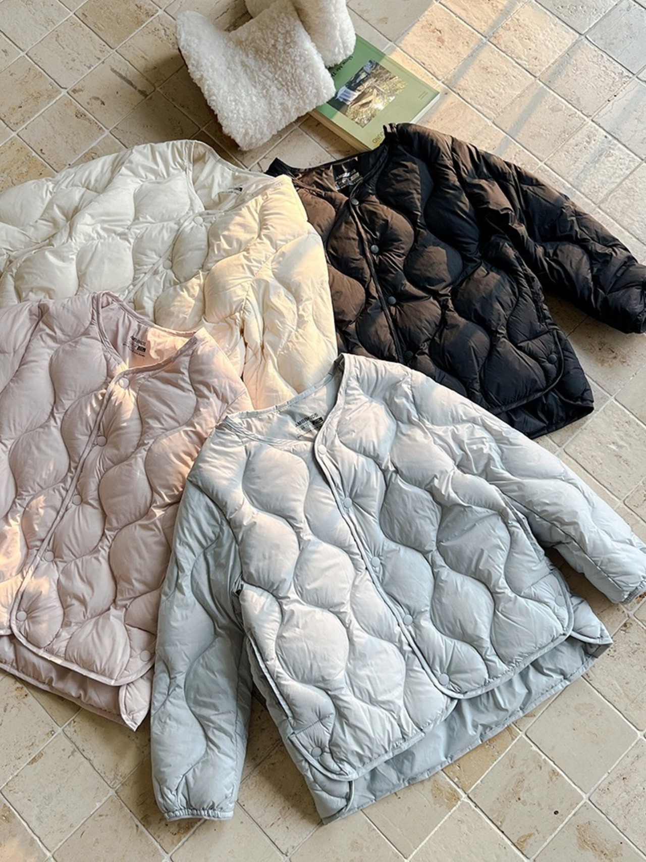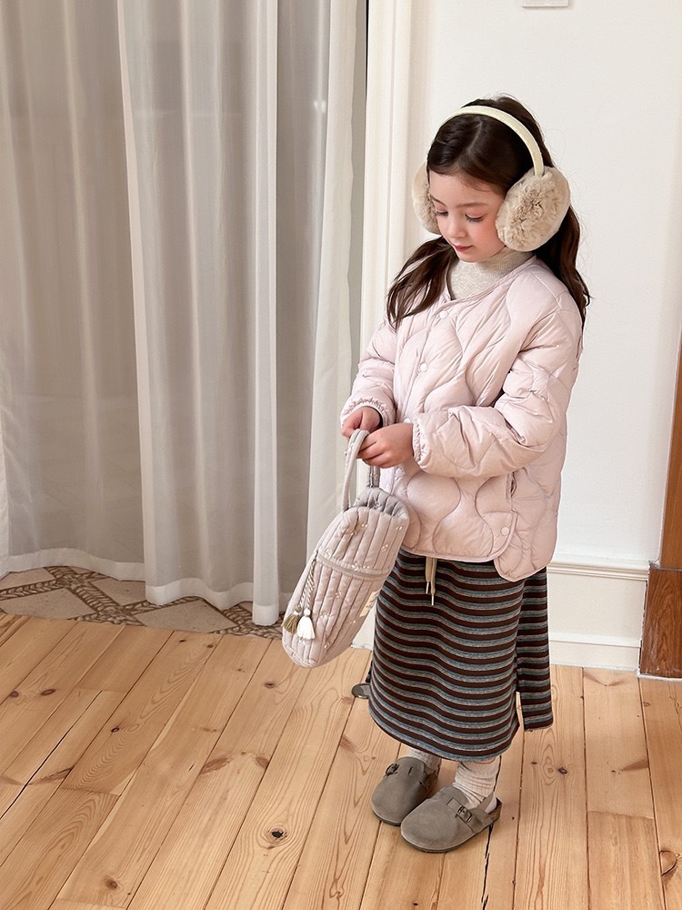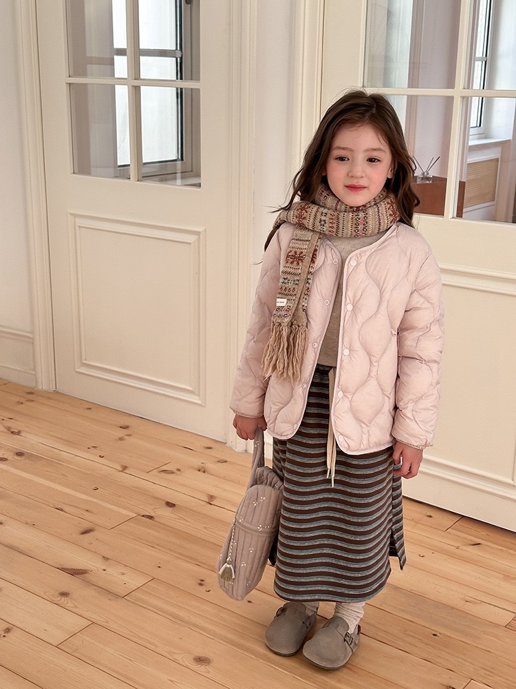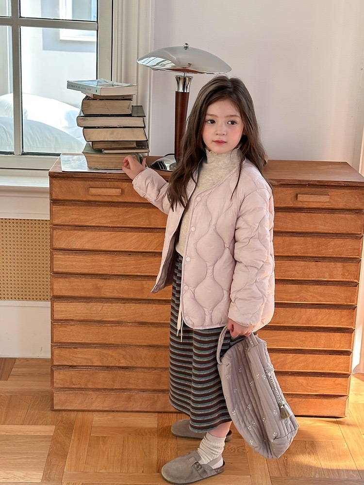 やわらかなペールピンクが可愛らしい印象の中綿キルティングジャケット。丸みを帯びたひょうたん型のステッチが上品で、軽やかなのにしっかり暖かい冬の定番アイテムです。軽量素材を使用しているため動きやすく、お子様の通園・通学・お出かけにも最適。内側までやわらかな裏地付きで保温性抜群。スカートやパンツなどどんなコーデにも合わせやすく、デイリーからフォーマルまで幅広く活躍します。