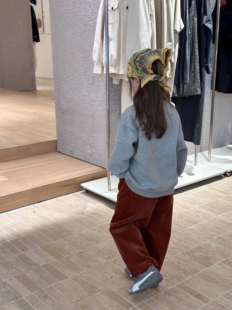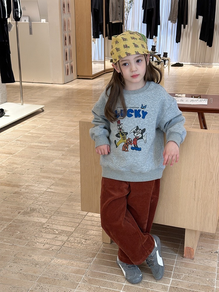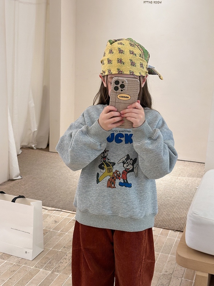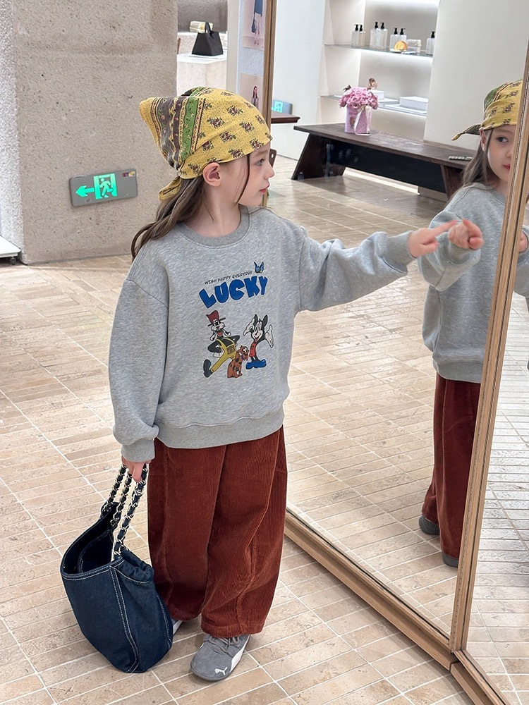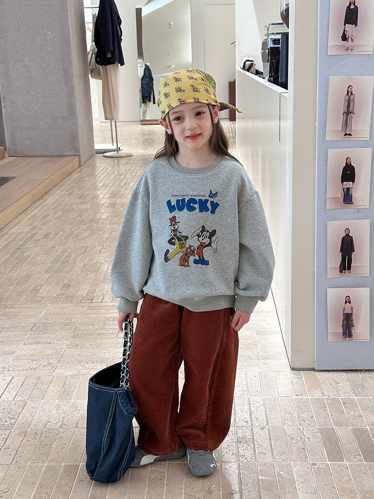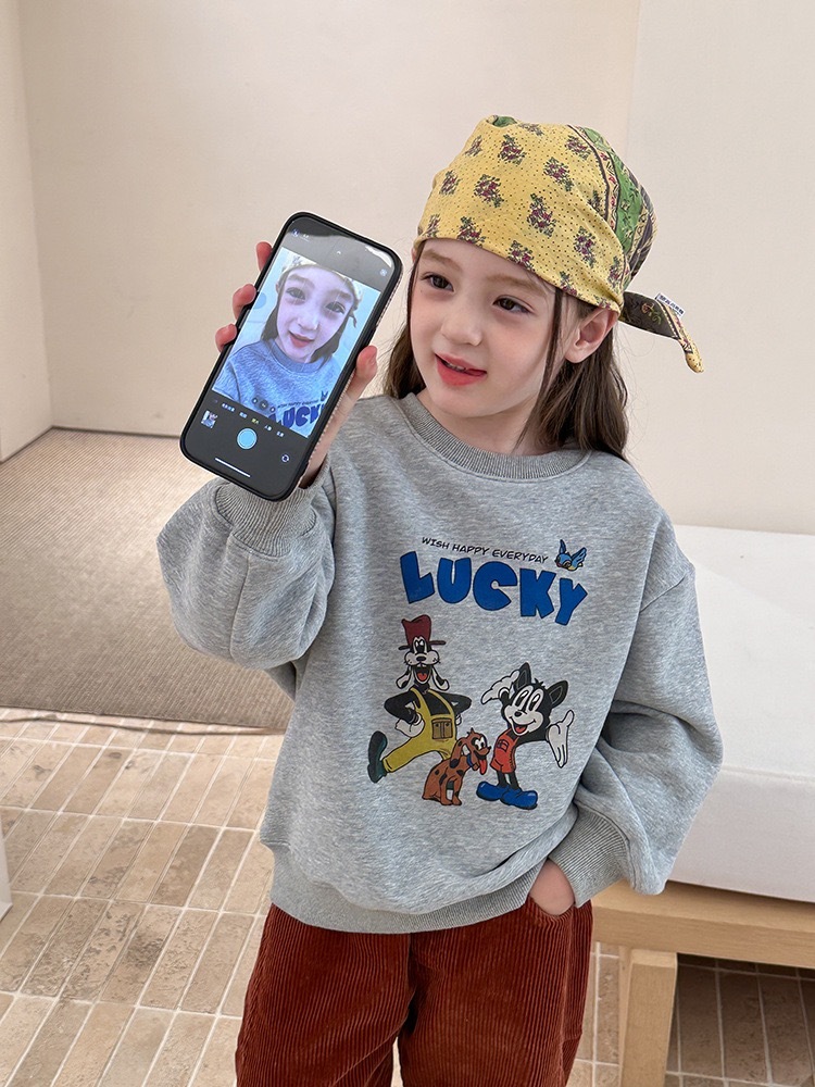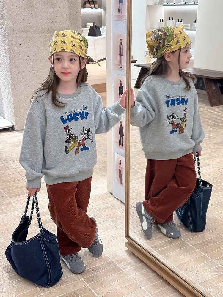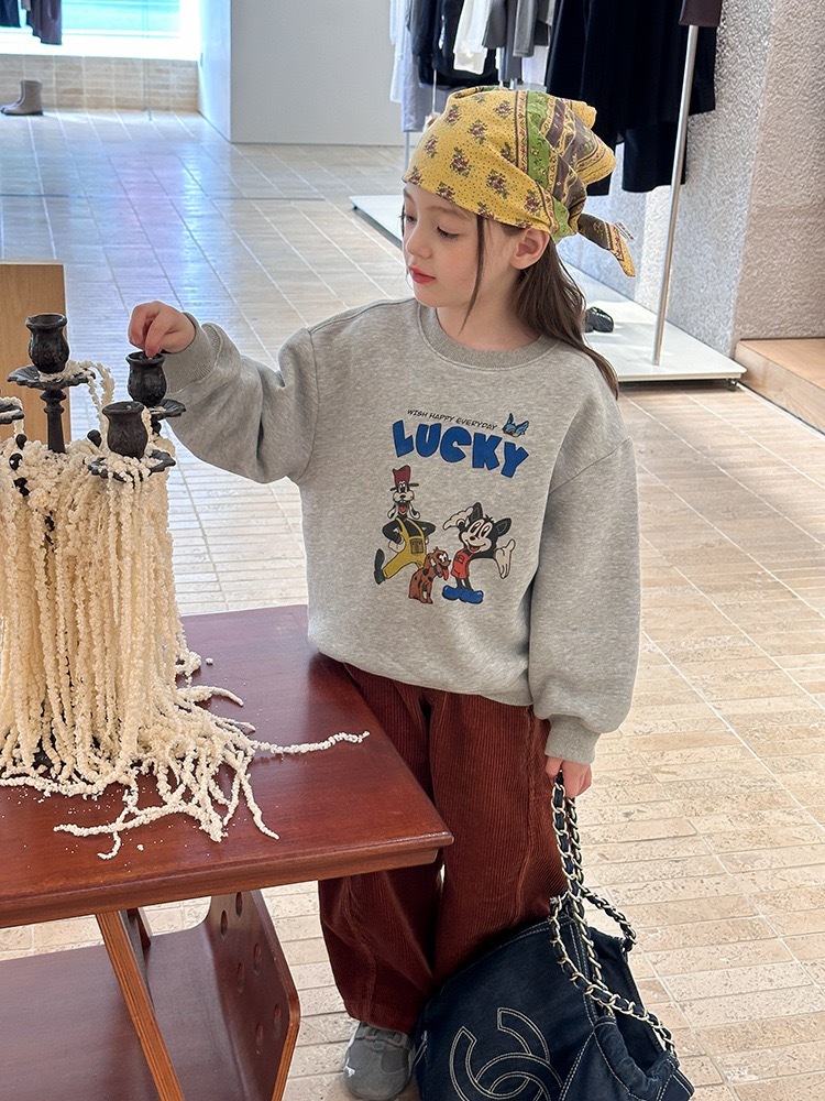 ポップな「LUCKY」プリントとキャラクターイラストが目を引く、秋冬にぴったりのキッズ用裏起毛スウェットです。柔らかなグレー地にカラフルなプリントが映え、デイリー使いにもお出かけにもぴったりの一枚。トレンドのゆったりシルエットで動きやすく、重ね着にも便利です。裏起毛仕様で保温性が高く、ふんわりとした着心地をお子さまに提供します。