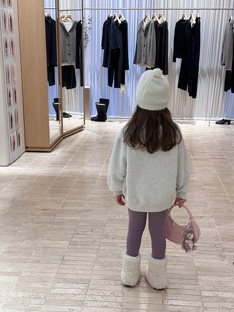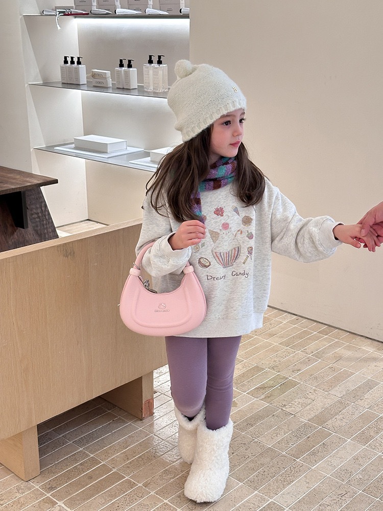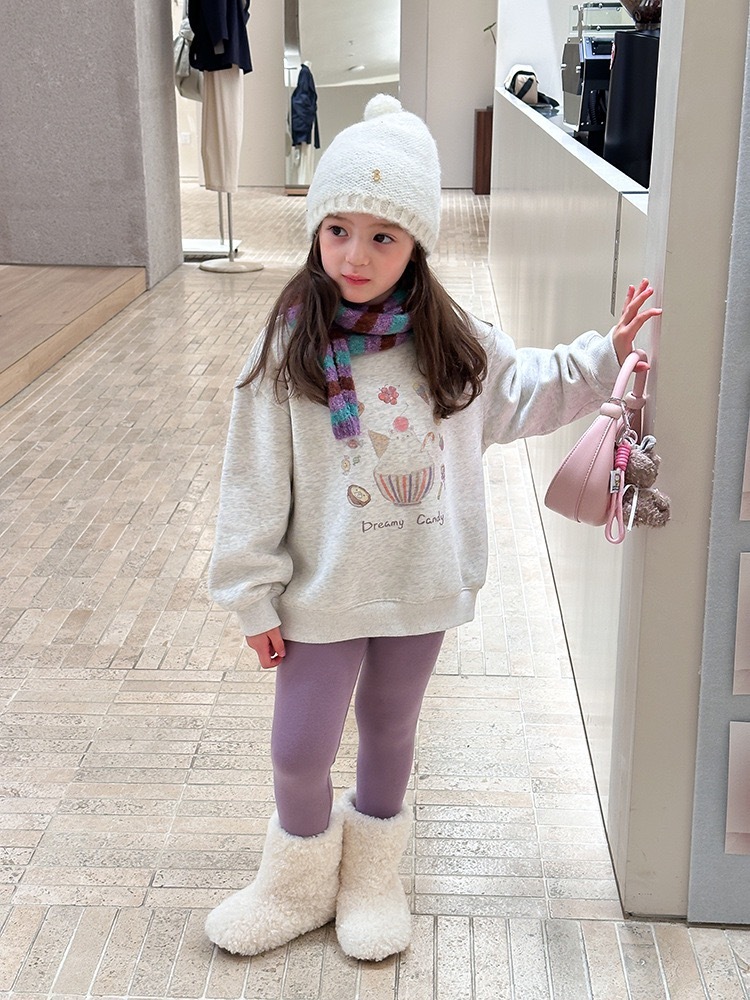 淡いグレーカラーに「Dreamy Candy」モチーフのプリントが映える、ガーリーで可愛らしいキッズトレーナーです。カップに詰められたお菓子やスイーツのイラストが優しい雰囲気を演出し、ナチュラルで温かみのあるデザイン。ややドロップショルダーのリラックスシルエットで動きやすく、裏起毛仕様で保温性も抜群。寒い季節のお出かけや通園にぴったりの一枚です。
