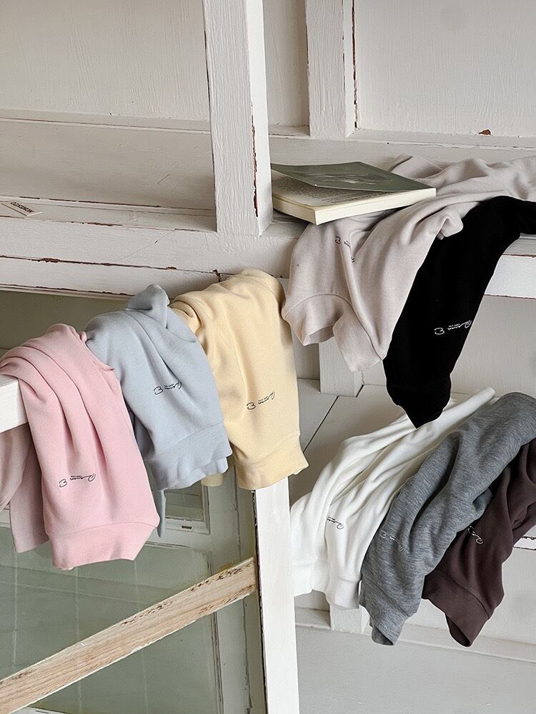 やさしいライトグレーカラーで、落ち着いたトーンながらも清潔感があり、どんなコーデにも馴染む万能アイテム。胸元に施された小さな英字ロゴがアクセントとなり、シンプルながらも上品な印象を与えます。柔らかくストレッチ性のある素材を使用し、お子さまの動きを妨げず快適に着用できます。男女兼用デザインで、秋冬のデイリーウェアや重ね着スタイルに最適です。
