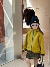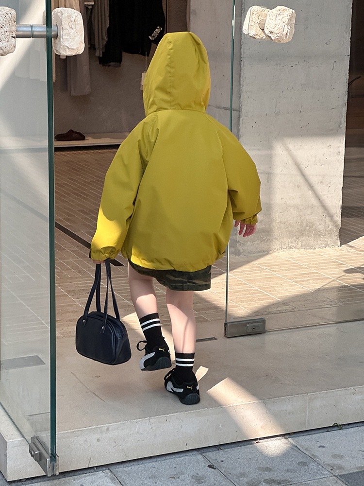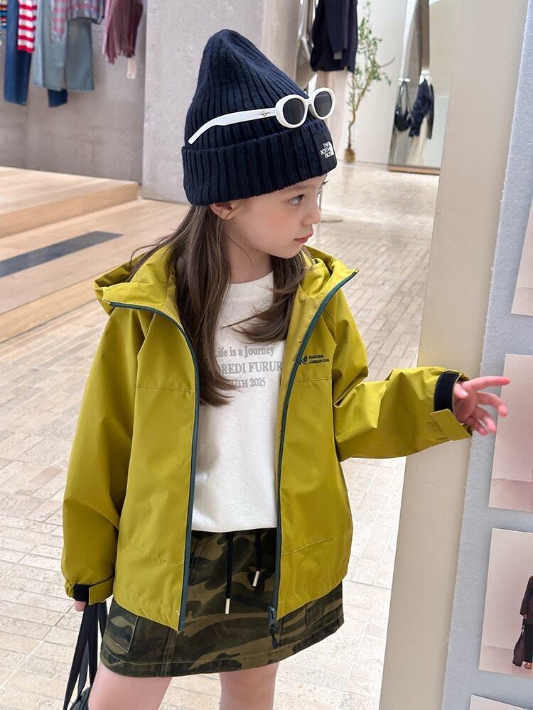 発色の美しいマスタードイエローに、ブラックファスナーを組み合わせたスタイリッシュなデザイン。軽量ながらも防風性と撥水性を備え、4級強效撥水加工により雨粒をしっかり弾く高機能アウターです。シンプルながら存在感があり、コーディネートの主役としても活躍。通園・通学・お出かけなど、デイリーからアウトドアまで幅広く対応します。