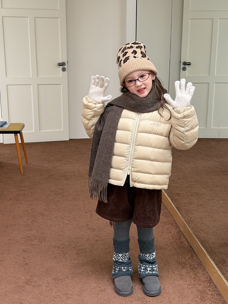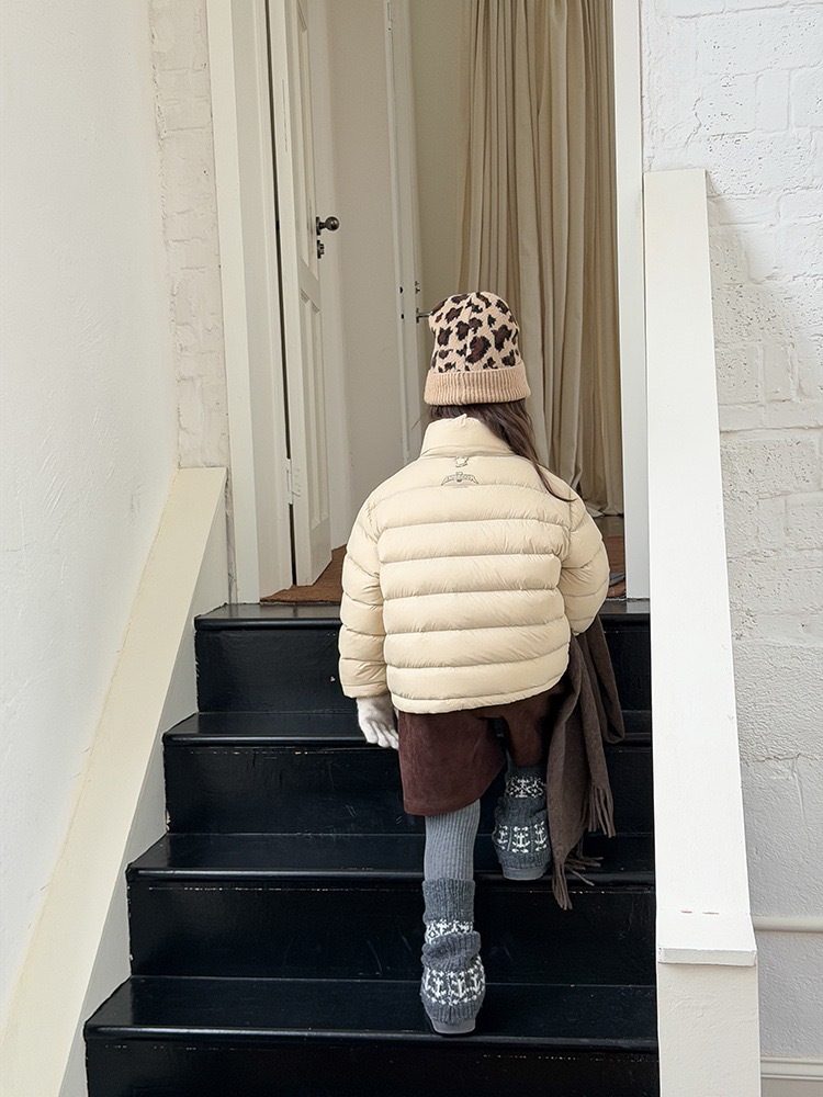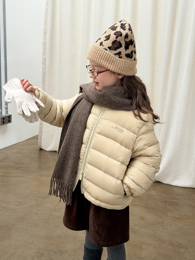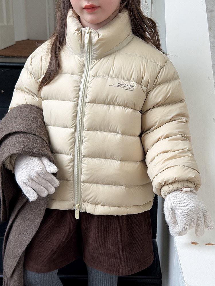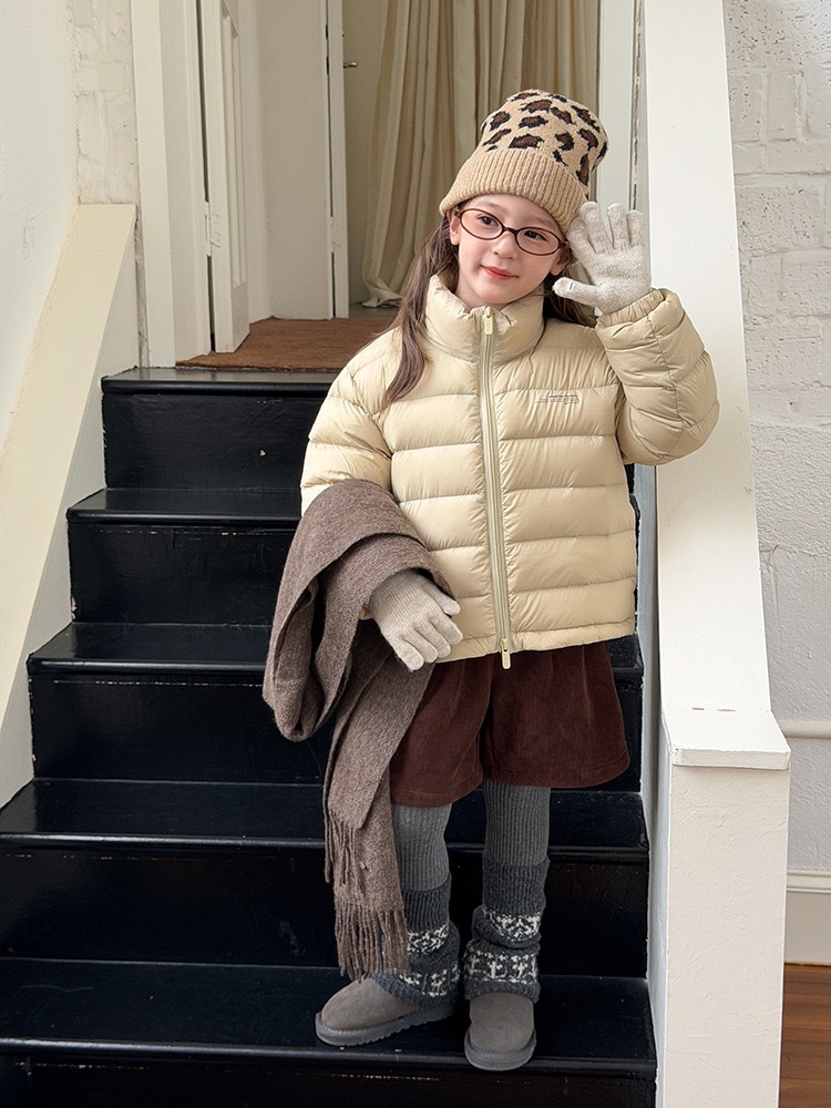 柔らかなミルクベージュカラーが上品で、どんなコーデにもなじむキッズ用ショート丈ダウンジャケット。