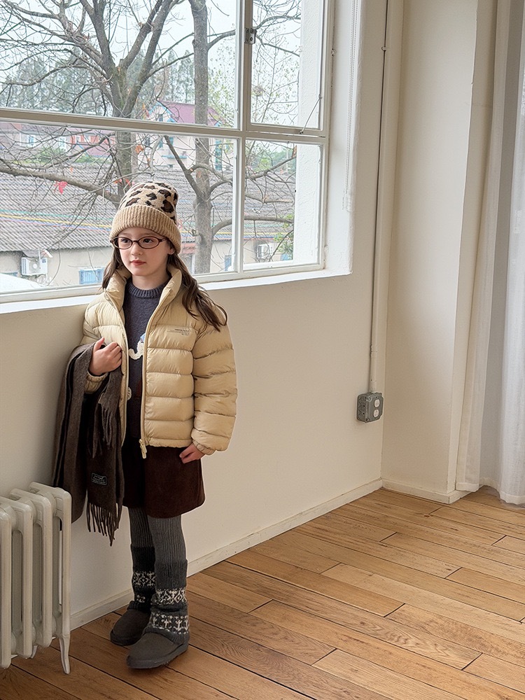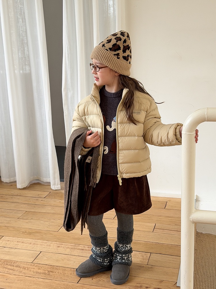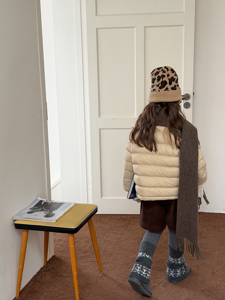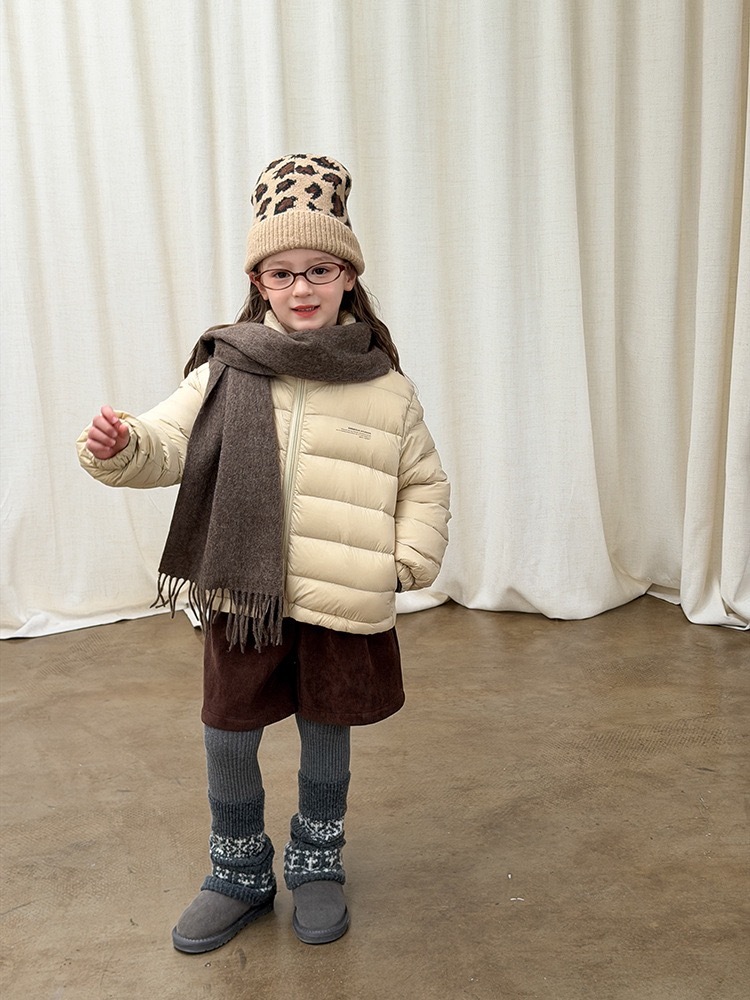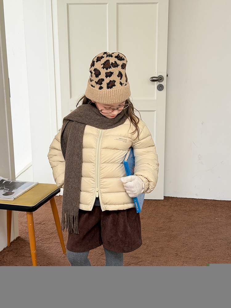 柔らかなミルクベージュカラーが上品で、どんなコーデにもなじむキッズ用ショート丈ダウンジャケット。