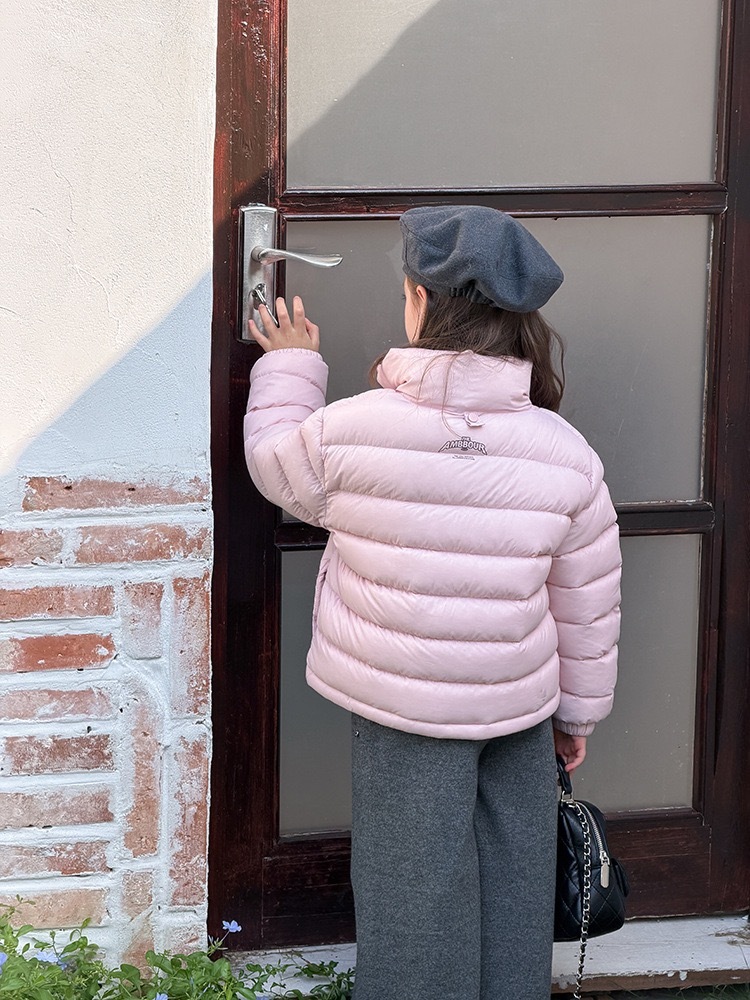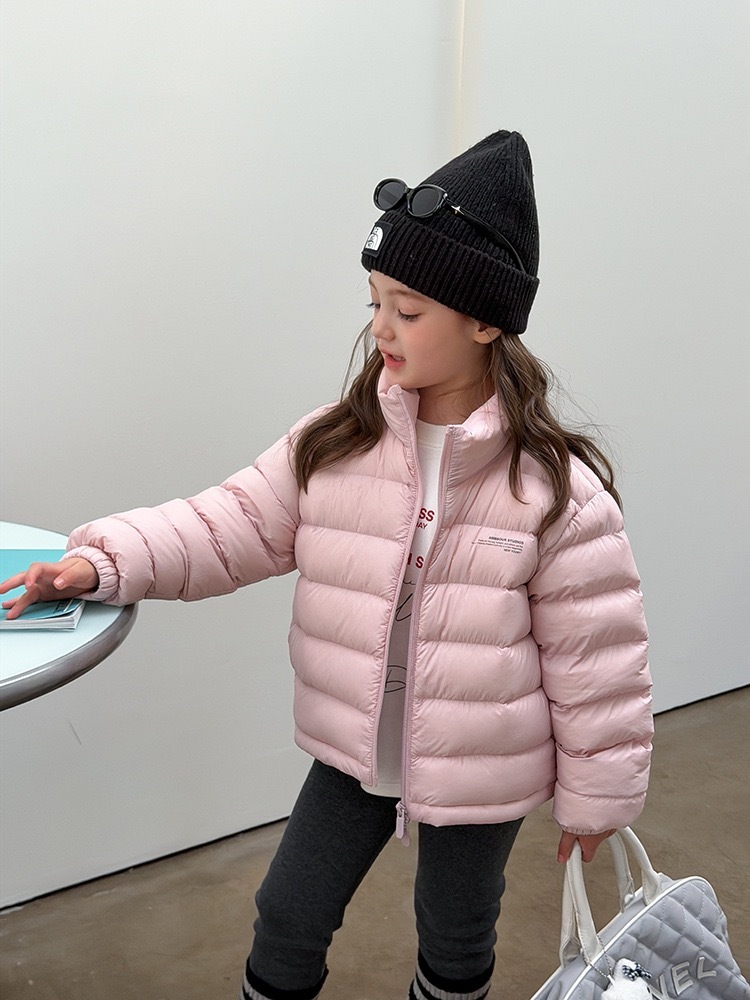 柔らかで上品な桜花ピンクカラーが魅力のキッズ用ショート丈ダウンジャケットです。