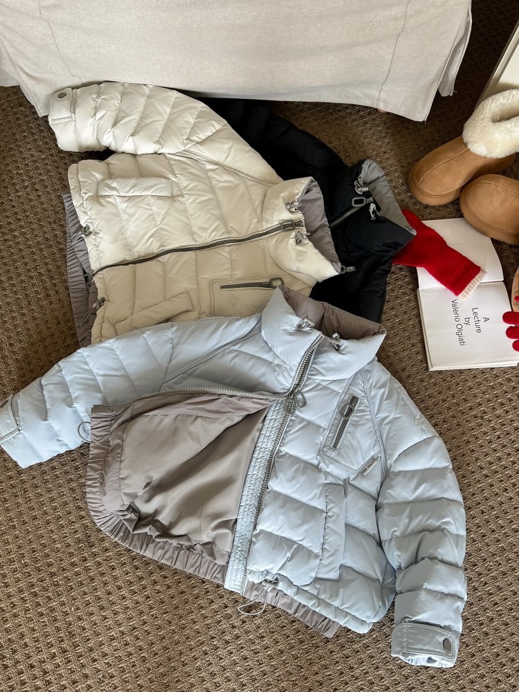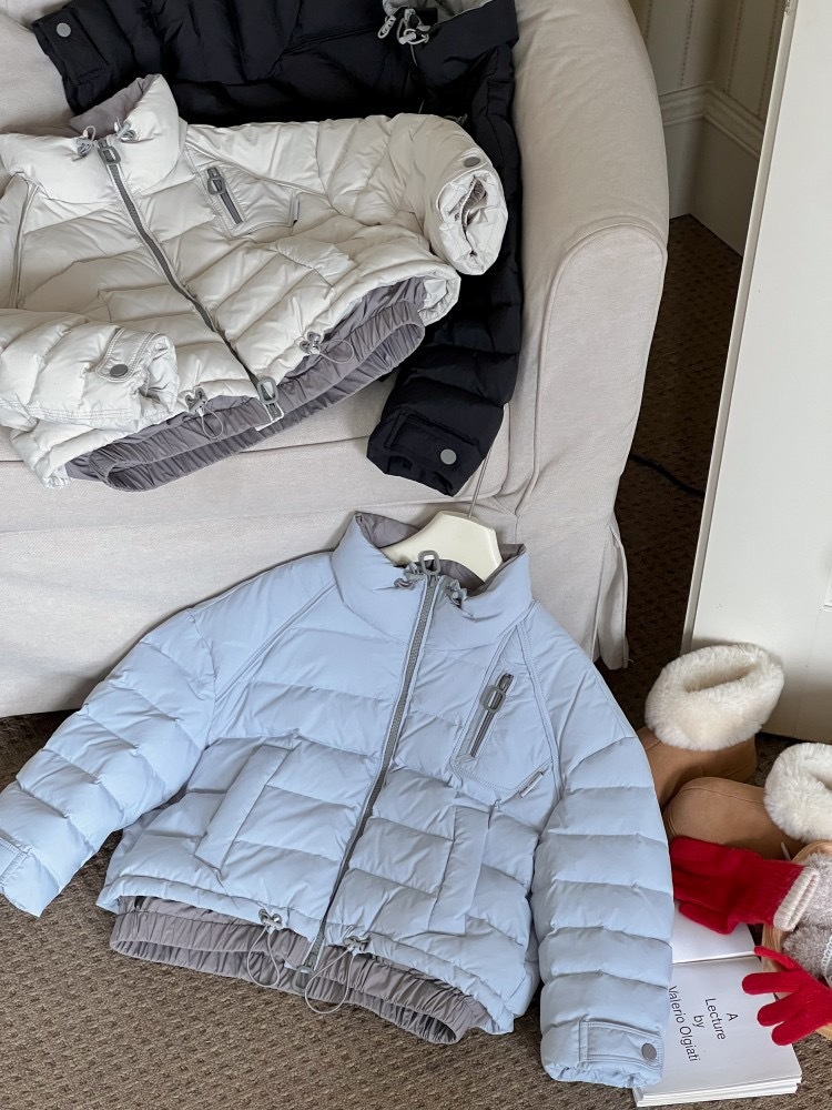 清潔感のある淡いブルーは、どんなコーデにも合わせやすく、冬の街中や通学シーンにも自然に馴染む万能カラー。裾部分にはドローコードを備え、シルエットの調整が可能。首元までしっかり防寒できる立ち襟デザインで、寒い日のお出かけも安心です。