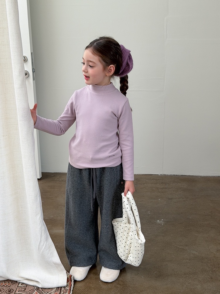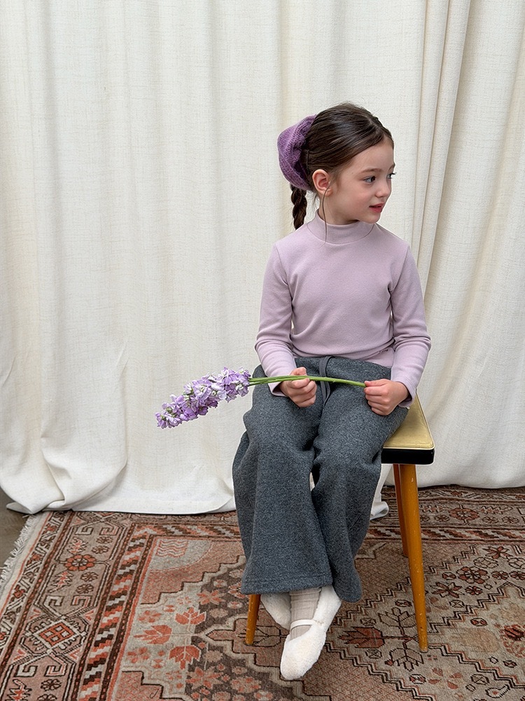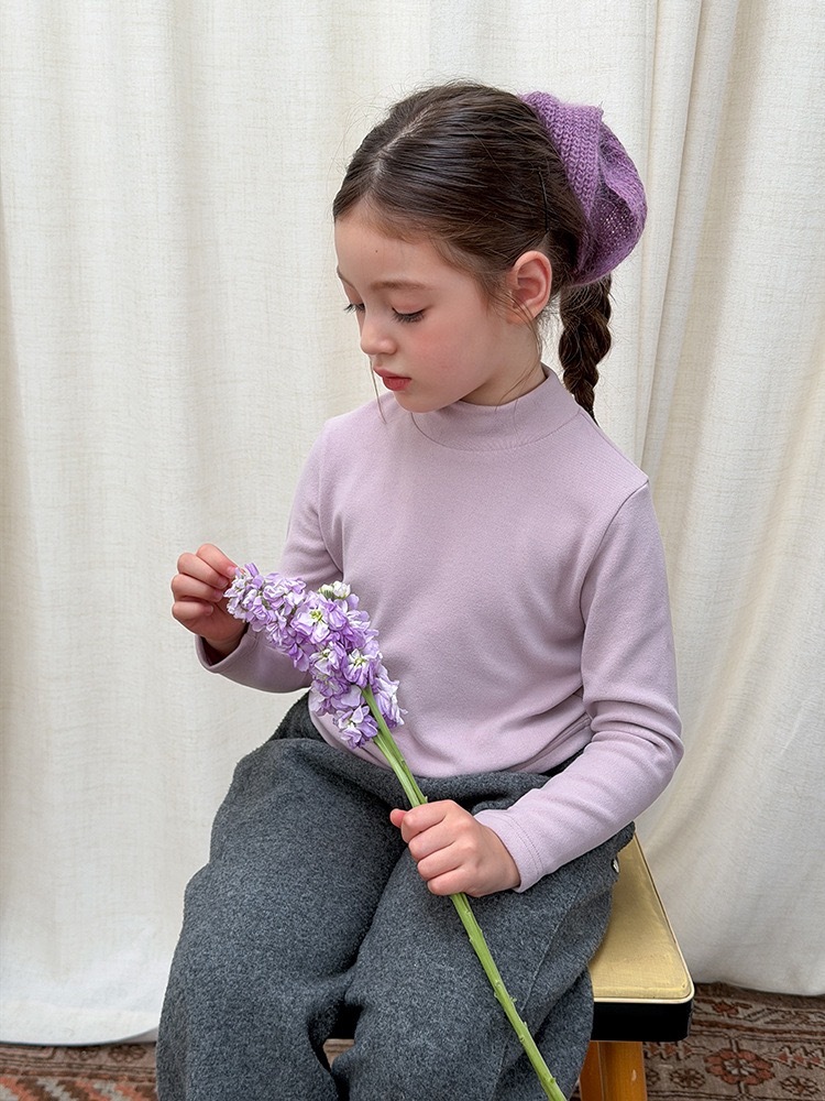 やさしいラベンダーパープルカラーが魅力の、モスウール混ハイネック長袖トップスです。上品でやわらかな色合いが、お子様の可愛らしさを引き立てる一枚。秋冬のインナーとしてはもちろん、1枚でもおしゃれに着こなせる万能トップスです。