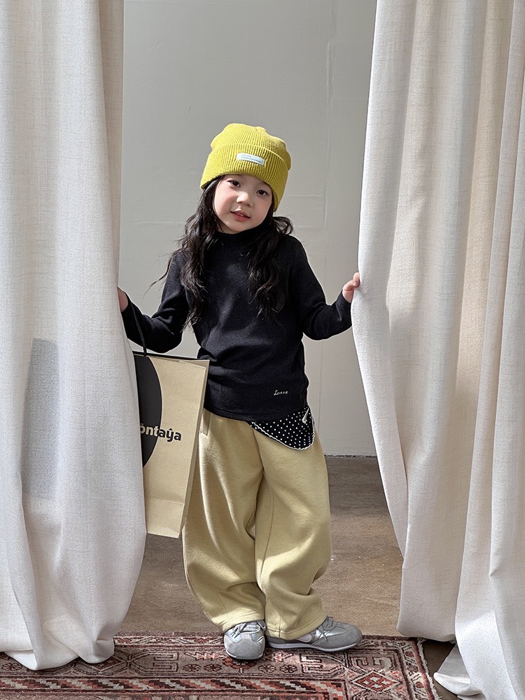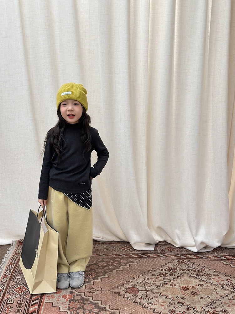 落ち着いたチャコールブラックカラーがスタイリッシュな印象の、モスウール混ハイネック長袖トップスです。どんなボトムスにも合わせやすい万能カラーで、通園・通学・お出かけ・発表会など幅広いシーンで活躍します。シンプルながらも高見えするデザインで、重ね着にも最適です。
