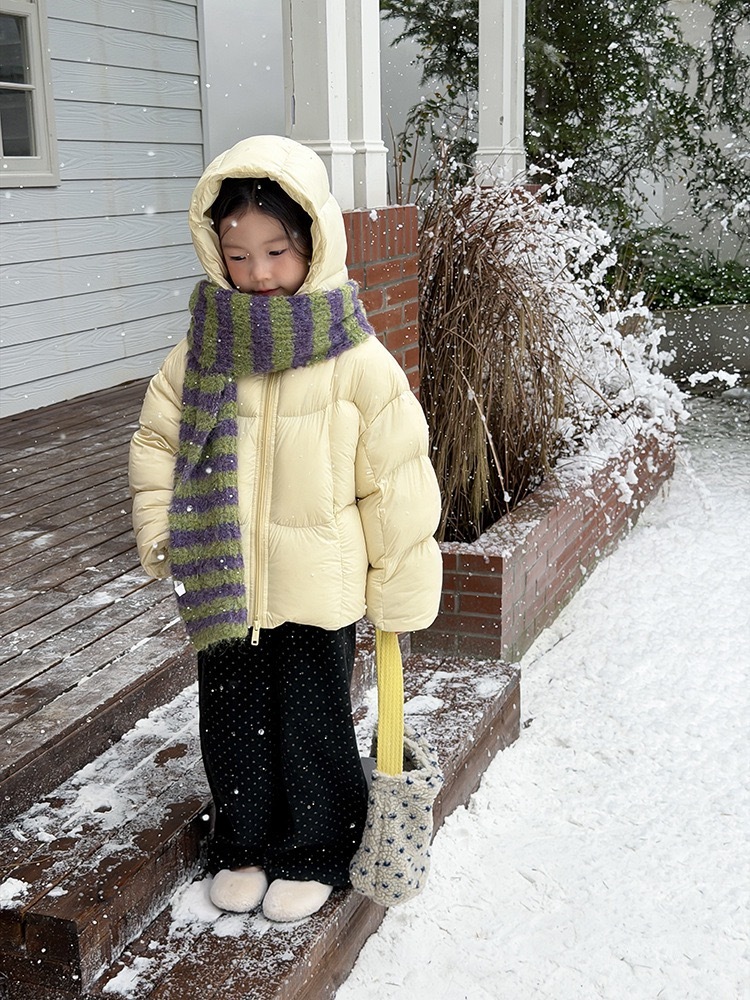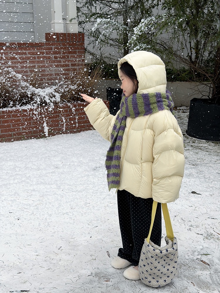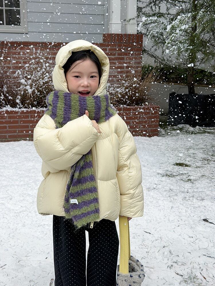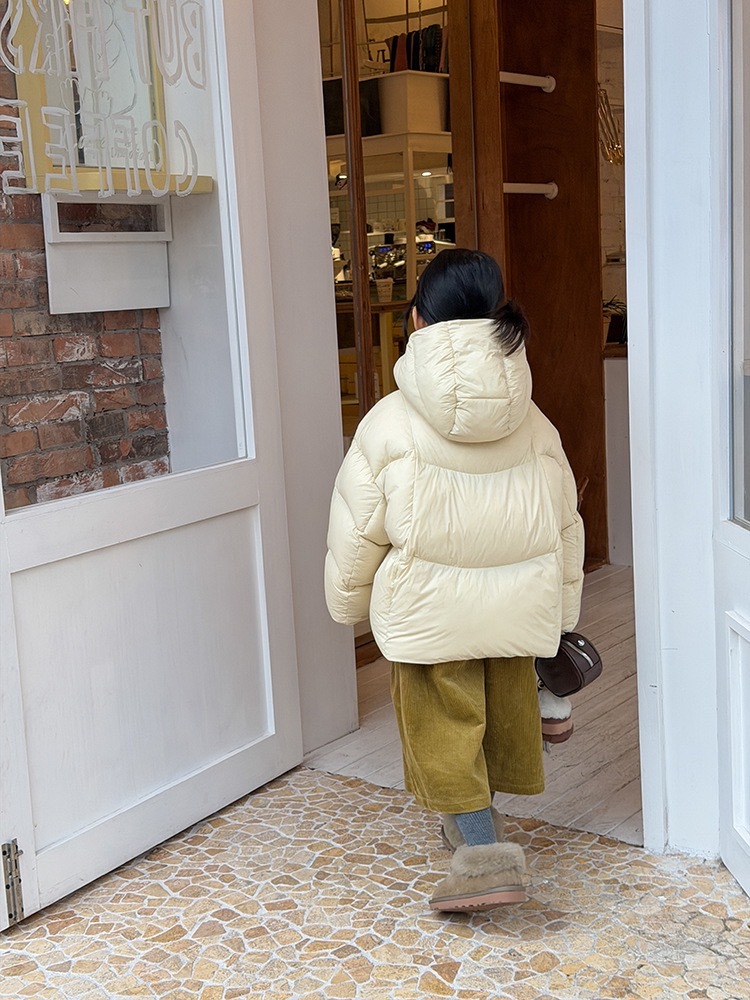 表地には高密度ポリエステル素材を採用し、防風性と耐久性に優れつつ、柔软处理によるしなやかな手触りで快適な着心地を実現。ショート丈デザインは動きやすく、日常の通学・外遊び・お出かけ・家族旅行など幅広い冬のシーンに大活躍します。淡い米杏色(アイボリー)は肌なじみが良く、男女問わず着やすい韓国風のシンプルデザインです。