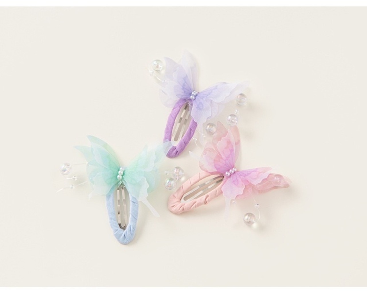 蝶結び付き シフォン パールヘアクリップ 3色展開ローズピンク ブルーグリーン パープル 四季対応 子供用 安全設計 蝶々パール付き ふんわりシフォン ヘアクリップ 子供用 かわいい髪飾り キッズ | Oct.ベビーショップ