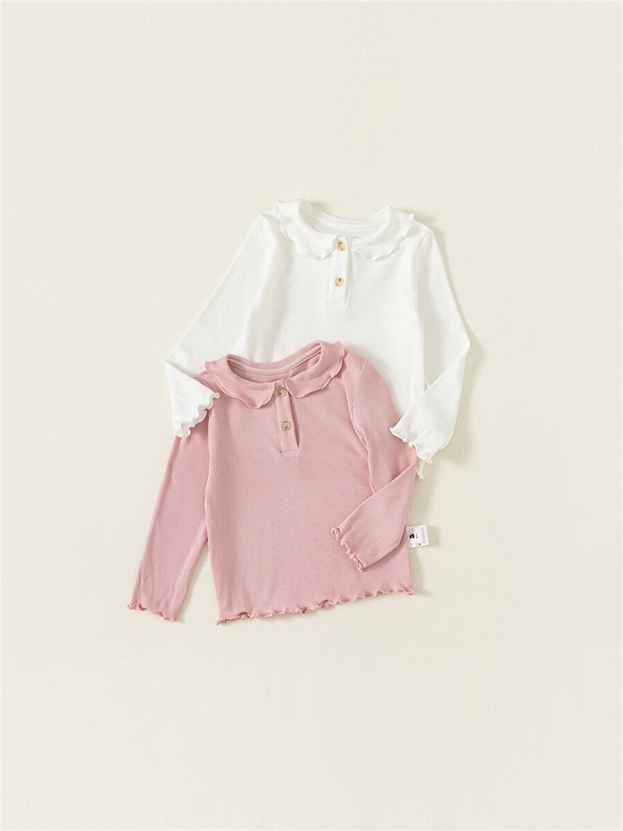 このリブニットトップスは、春と秋の季節にぴったりの軽やかで着心地の良い一枚です。93.5%ビスコースと6.5%スパンデックスの素材で作られ、ソフトな肌触りと優れた伸縮性を提供します。子どもたちが快適に過ごせるようデザインされており、白とピンクの2色展開です。
