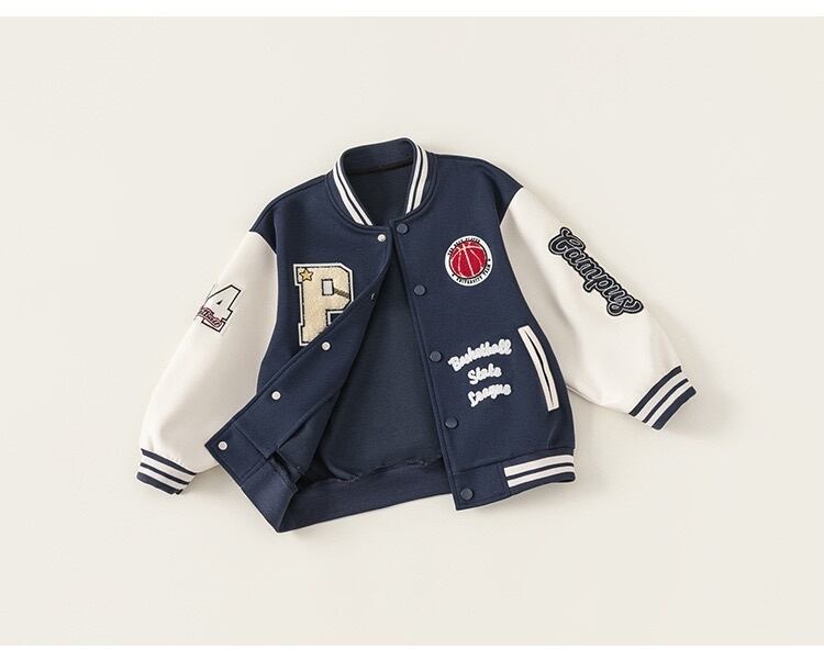 この男の子用ボンバージャケットは、秋冬シーズンにぴったりのスタイリッシュで快適なアイテムです。ダークネイビーを基調としたデザインに、個性的なバスケットボール柄の刺繍と「P」のロゴが施されており、カジュアルなスポーティスタイルを演出します。おしゃれでありながら、日常使いにも最適です。