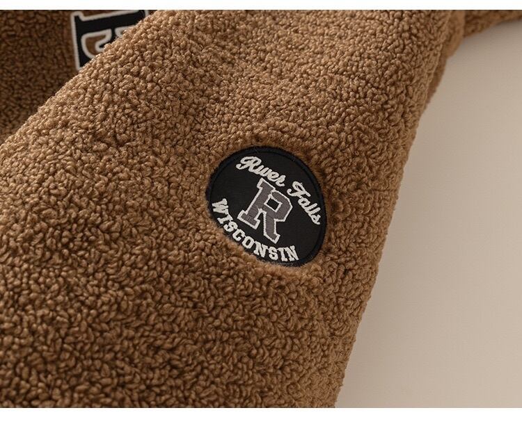 このキッズ用ジャケットは、寒い冬のシーズンに最適なデザインと素材が特徴です。保温性とスタイルを兼ね備えた一着で、ふわふわのボア素材が全体を覆い、お子様に優しく暖かい着心地を提供します。立体的なアルファベット刺繍と袖の「River Falls Wisconsin」ワッペンがデザインのアクセントになり、アメリカンカジュアルな雰囲気をプラスしています。