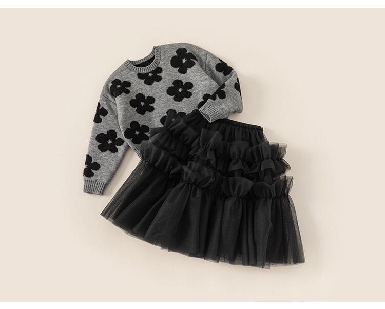 この冬にぴったりの、ファッショナブルで暖かい花柄ニットとブラックチュールスカートのセットアップです。グレーとブラックの色使いが落ち着いた雰囲気を演出し、お子様の魅力を引き立てます。