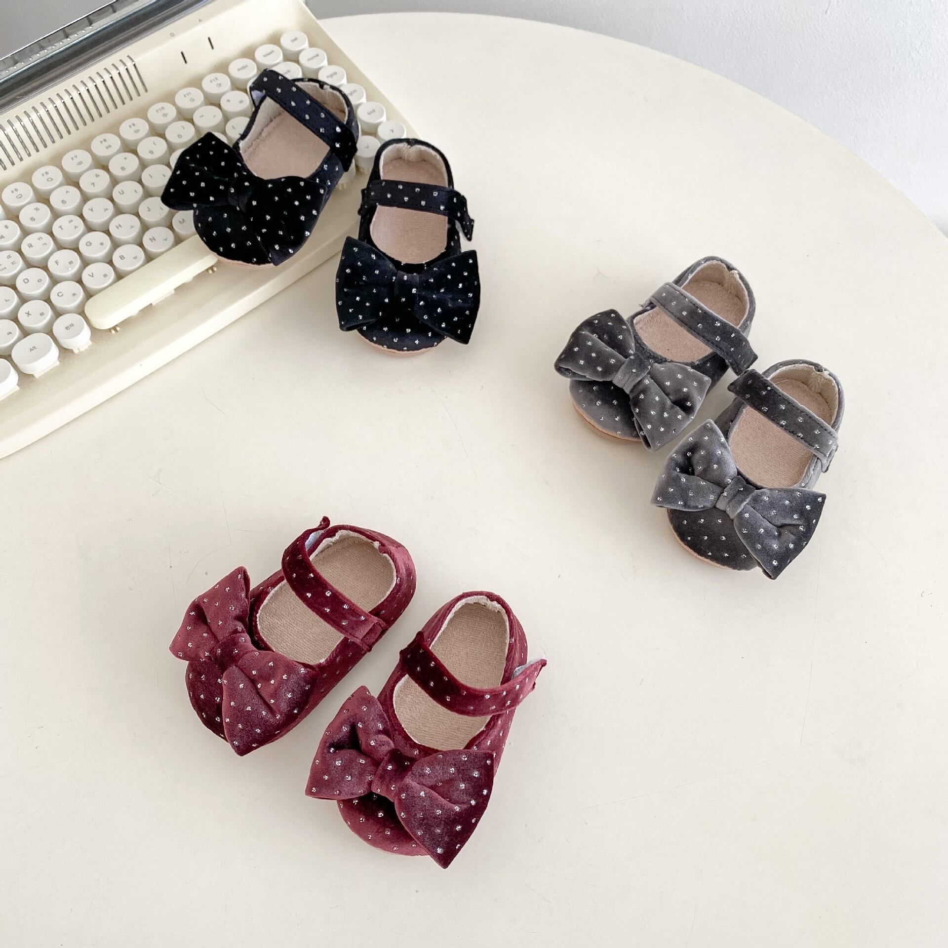 キッズ エレガント リボン ドット柄 ベルベット ベビーシューズ 赤ちゃんの初歩きに最適な柔らか マジックテープ仕様 滑り止め 子供用 ラバーソール 3色展開 ブラック ワインレッド グレー 女の子 | Oct.ベビーショップ