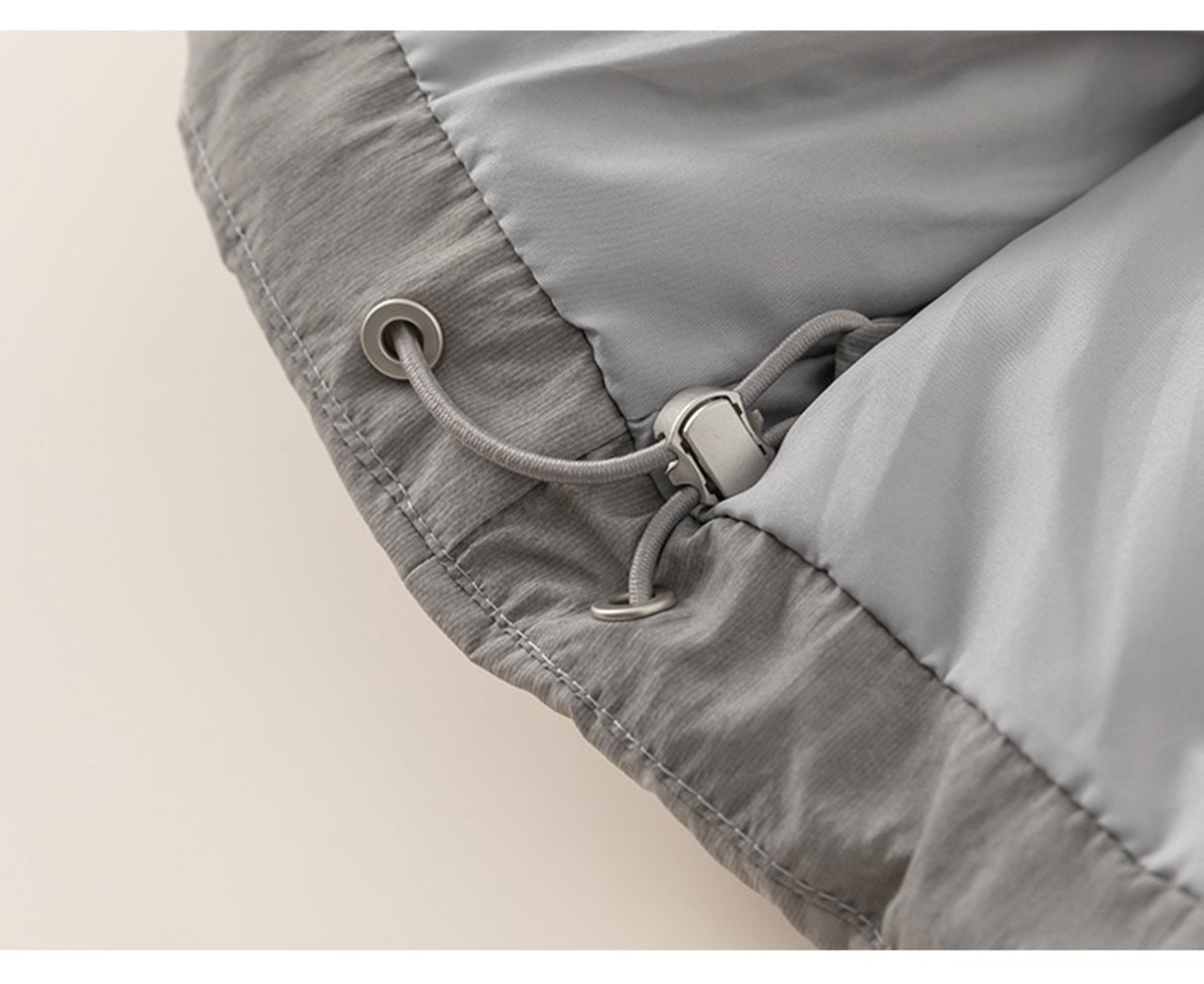 フードは取り外し可能なデザインで、寒い風を防ぐだけでなく、状況に応じて取り外しができるため、便利にお使いいただけます。袖口には伸縮性のあるゴム仕様が施されており、冷気の侵入を防ぎつつ動きやすさを確保しています。両側に大容量のポケットが付いており、お子様のおもちゃや小物を収納するのに便利です。また、裾部分にはドローコードが装備されており、フィット感の調整が可能です。広めのシルエットとシンプルでスタイリッシュな灰色のデザインは、どんなスタイルにも合わせやすく、カジュアルからお出かけまで幅広く活躍します。