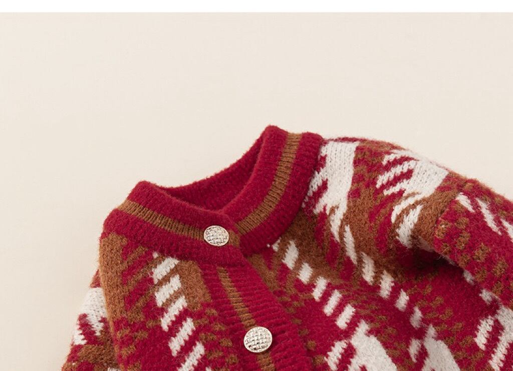 赤色幾何学柄ニットカーディガンは、お子様の冬の毎日に最適な暖かさと動きやすさを兼ね備えたアイテムです。デザイン性にも優れており、普段使いからお出かけまで幅広くご活用いただけます。