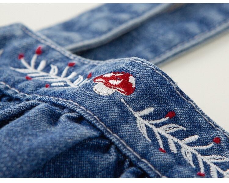 赤いマッシュルームとキャラクターの刺繍が胸元に施され、鮮やかで子どもらしいデザイン。襟元にも同じマッシュルーム刺繍が入り、細部までこだわった仕上がりです。