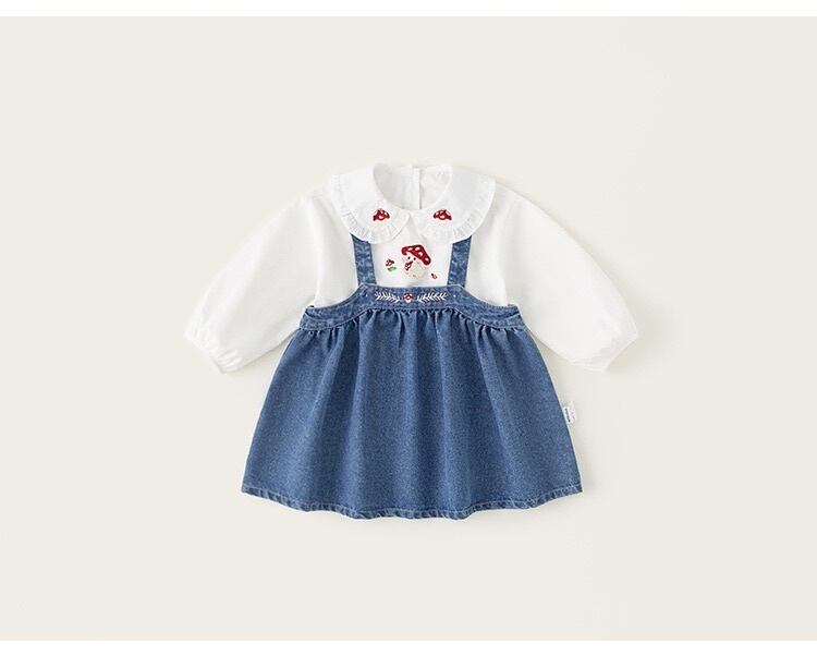 ホワイトのシャツにデニム素材のサスペンダースカートが一体化されたデザインで、カジュアルにもお出かけ着としても使える一枚。お子様の魅力をさらに引き立てるキュートなディテールがたくさん詰まっています。