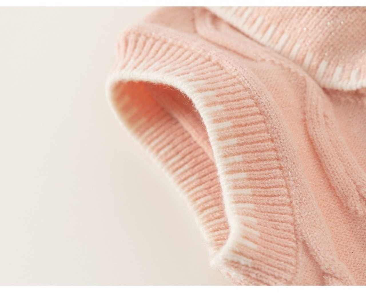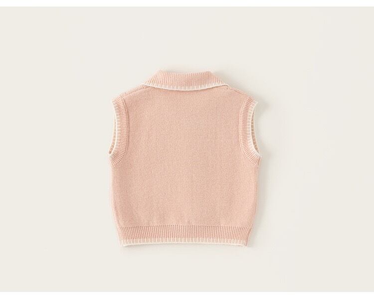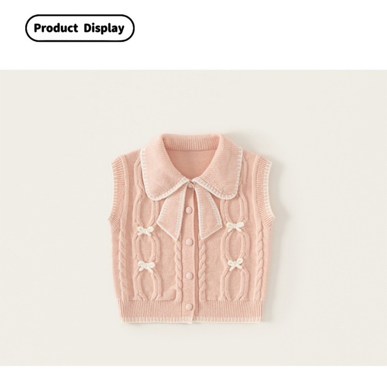 おしゃれで実用性も兼ね備えた、春秋シーズンにぴったりの子ども用ニットベストです。洋風デザインの襟が特徴的で、上品な仕上がりがどんなコーディネートにもマッチします。ケーブル編み模様と蝶結びの装飾が全体にあしらわれ、子どもの可愛らしさを引き立てます。フロントボタンで着脱が簡単なので、忙しい朝の準備も楽々。動きやすいゆったりとしたシルエットで、お子様の快適な動きをサポートします。