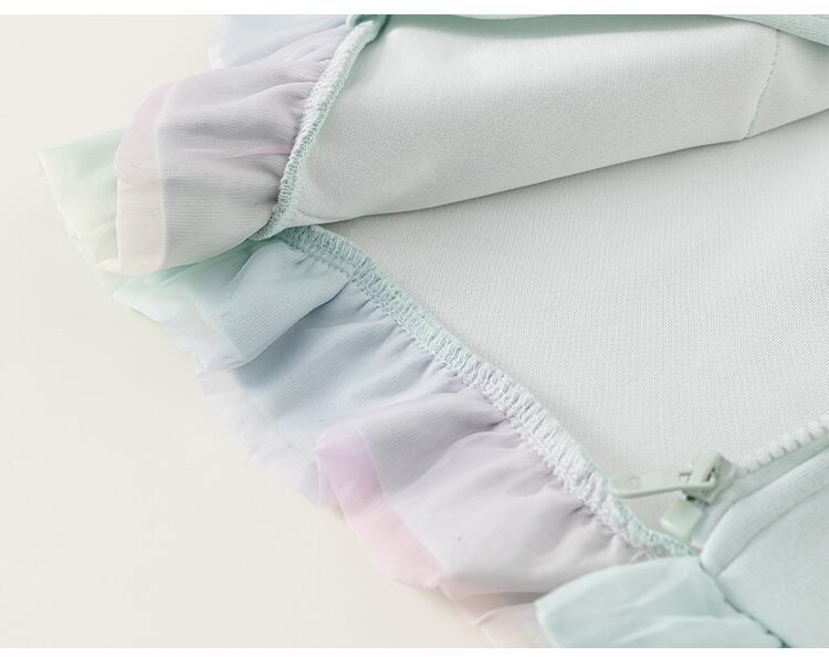 裾部分には淡いグラデーションカラーのメッシュフリルがあしらわれ、動くたびにふわっと揺れて可愛さを引き立てます。ガーリーな印象をプラス。