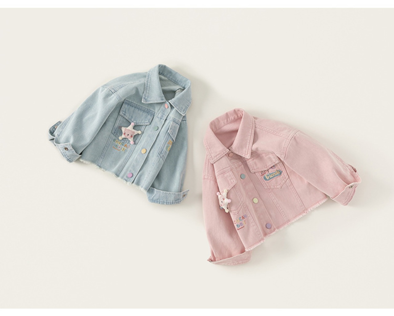 春秋向け 韓国風 刺繍入りデニムジャケット ベビー・キッズ 90-130cm 立体ぬいぐるみ付き おしゃれカジュアル ボタン開閉 柔らかいコットン素材 男女兼用 ライトデニムブルー ピンク | Oct.ベビーショップ