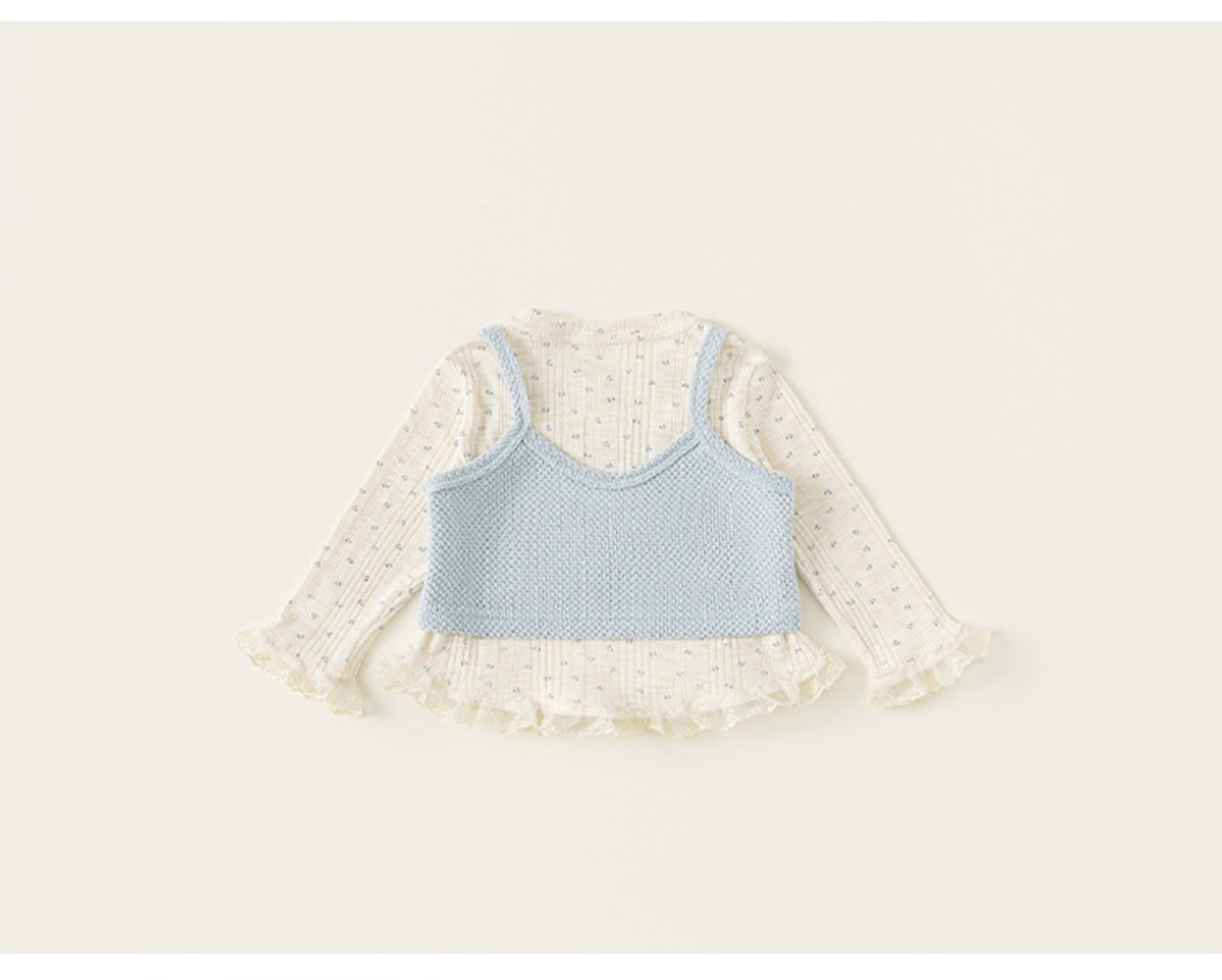 レースブラウスとニットキャミソールがセットになった、女の子らしい可愛らしいデザインのトップスセットです。ブラウスは柔らかいコットン混素材で、小花柄が施されたナチュラルなデザイン。キャミソールは伸縮性のあるニット生地で、優しく体にフィットします。ふんわりとしたレース袖口やフリル付きの裾が上品で可愛らしく、おしゃれなコーディネートを演出します。